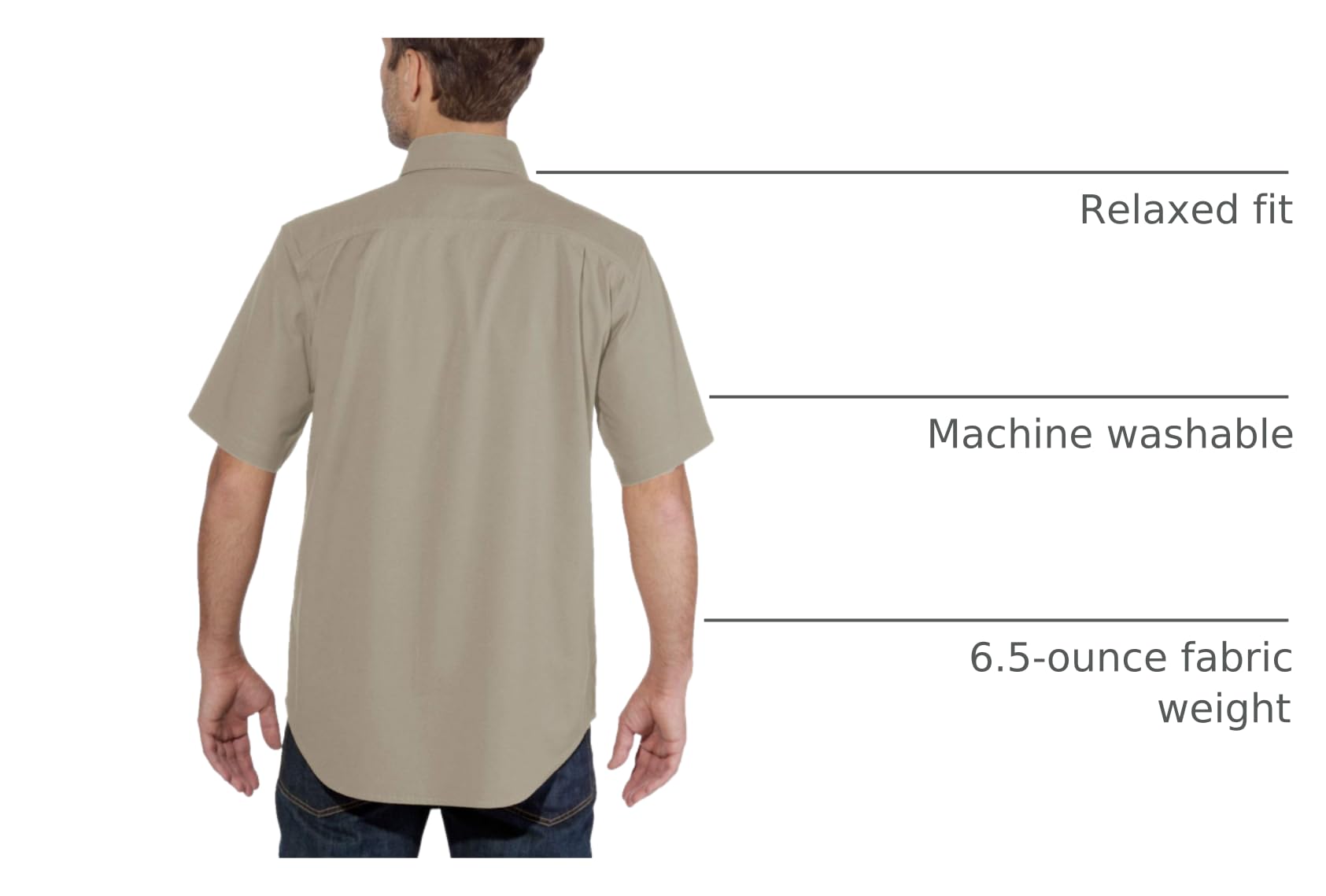 Description This durable short-sleeve work shirt comes standard with built-in stretch, so whatever you're doing, it's easier to do. Relaxed fit 6.5-Ounce, 98% cotton/2% Spandex rugged flex technology for ease of movement two chest pockets with additional left-chest pocket panel for added storage button-down collar two-button adjustable cuffs with extended plackets faux horn buttons drop-tail hem for additional coverage Carhartt-strong triple-stitched main seams imported