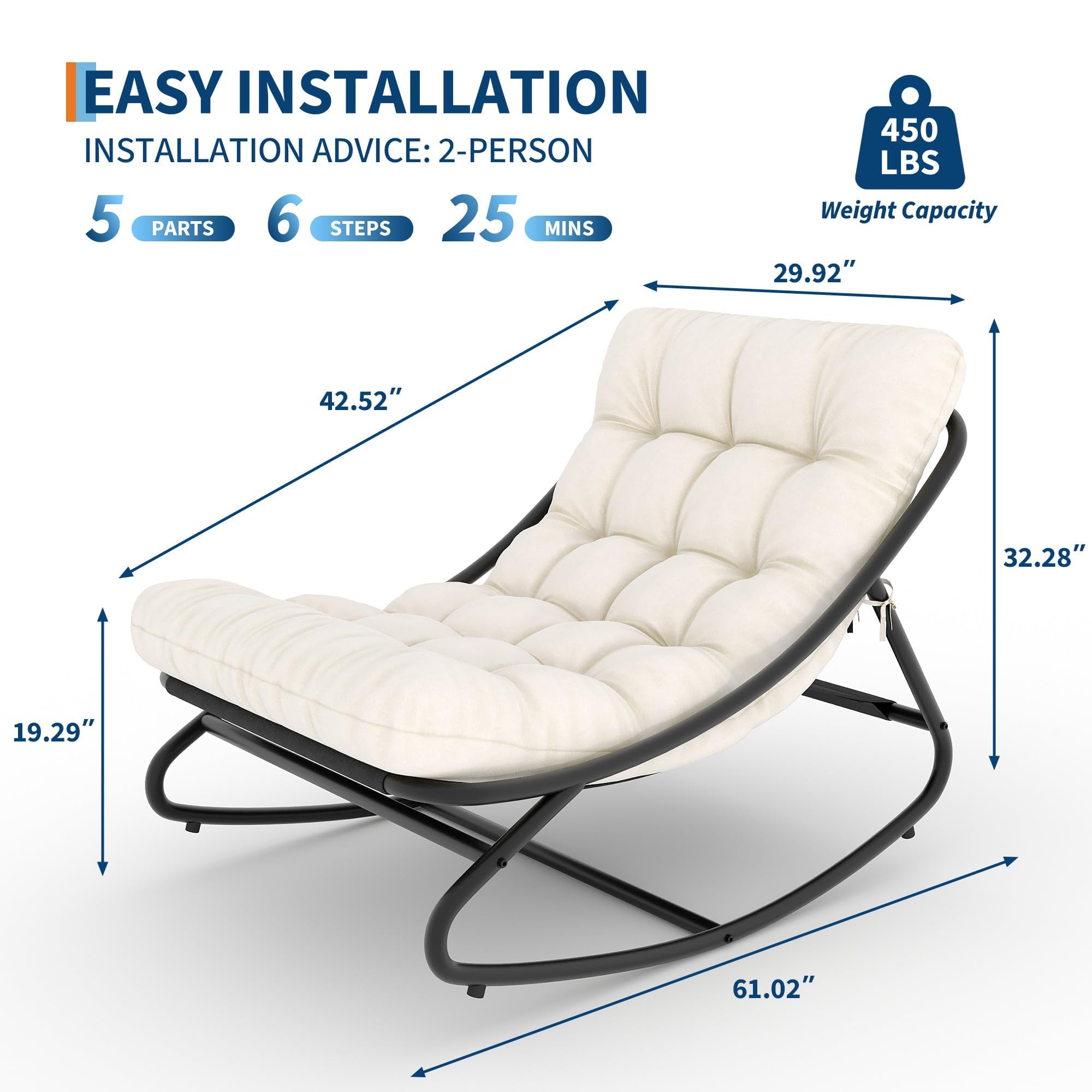 HEAVY DUTY CONSTRUCTION: The rocking chair features a durable design with a high-quality powder-coated steel frame for superior rust resistance. Holds up to 450 pounds to ensure stability and safety. Anti-tip safety knobs ensure safe use on any ground surface.