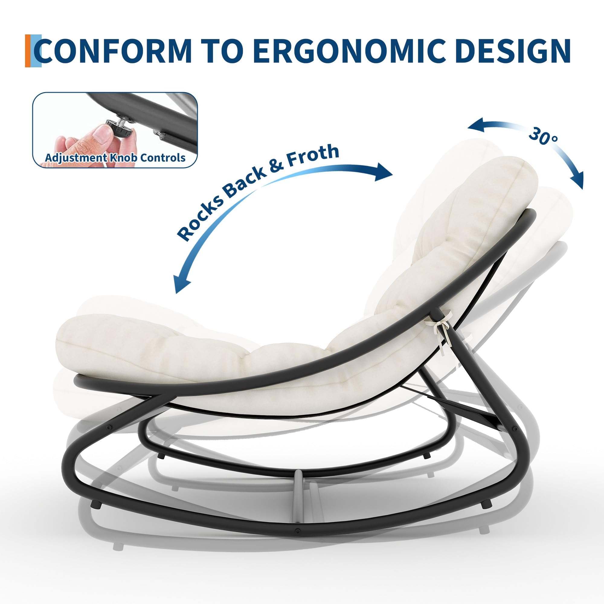 ERGONOMIC SUPPORT DESIGN: Immerse yourself in a cloud-like comfort experience with our thickened cushions that perfectly fit the human body's curves and are not easily deformed.The 30° gentle rocking angle effectively relieves muscle tension, allowing your body and mind to achieve complete relaxation.