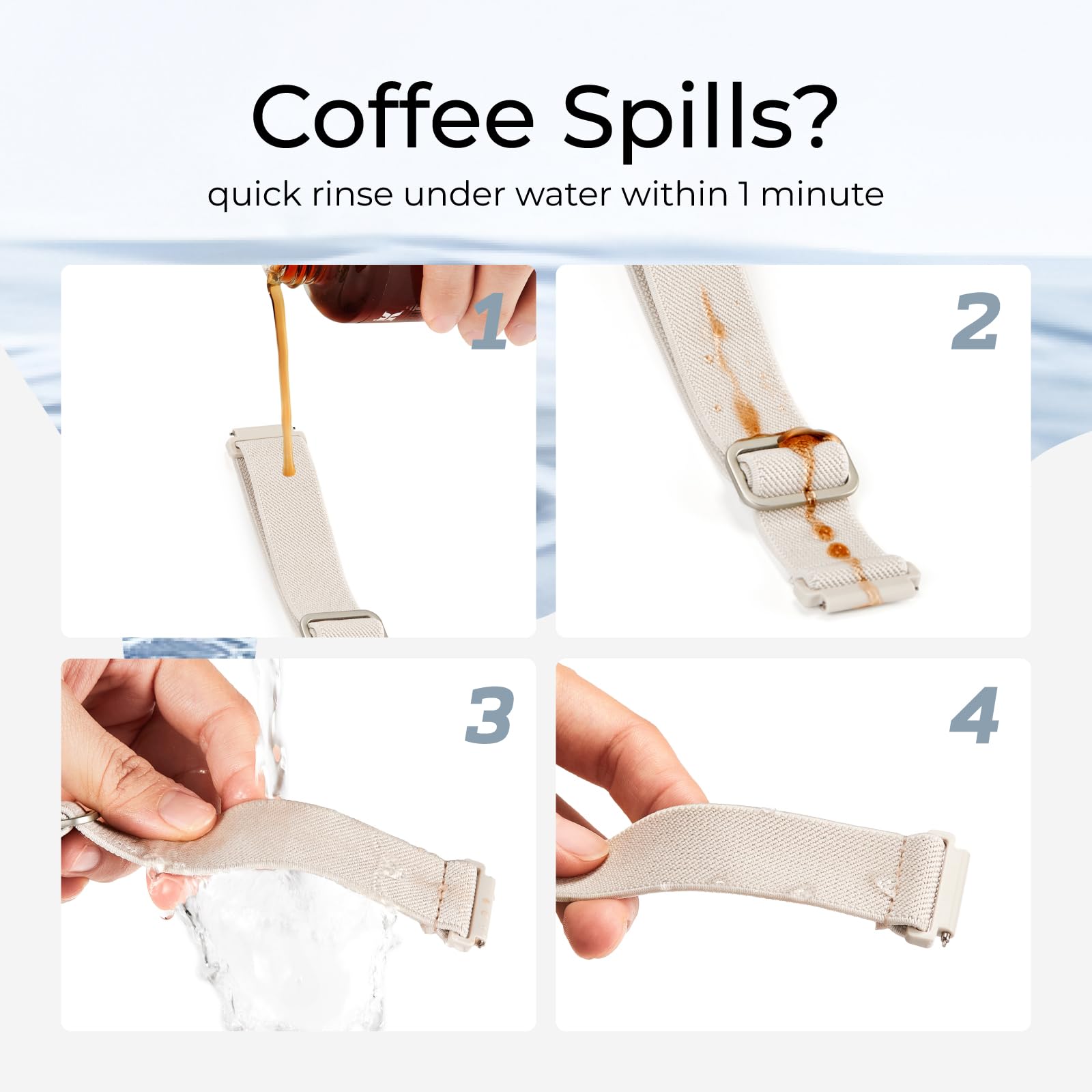 【Water Resistant】Acextro innovative splash-proof stretchy Samsung Galaxy Watch band allows droplets slides away which makes it handle sweat, light rain, and even accidental splashes without any issues. For some types of spills on this galaxy watch 7 band, like coffee, just a quick rinse under water within 1 minute and you will get a clean band