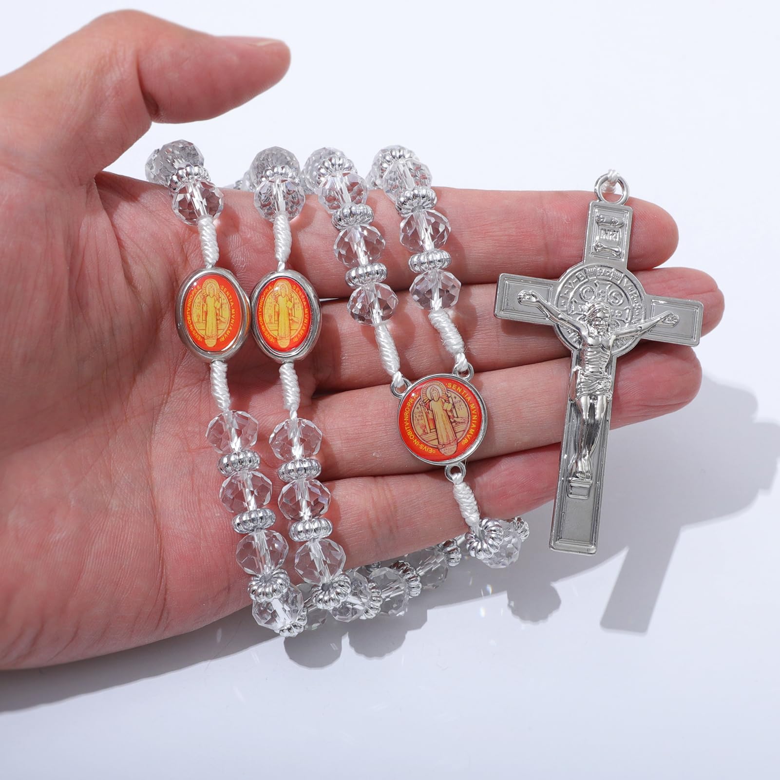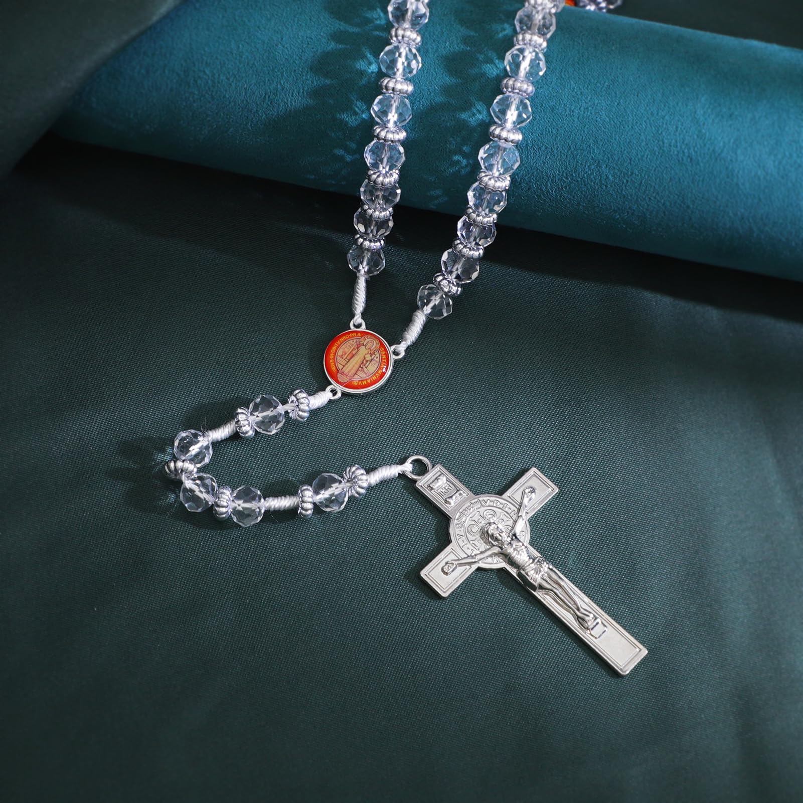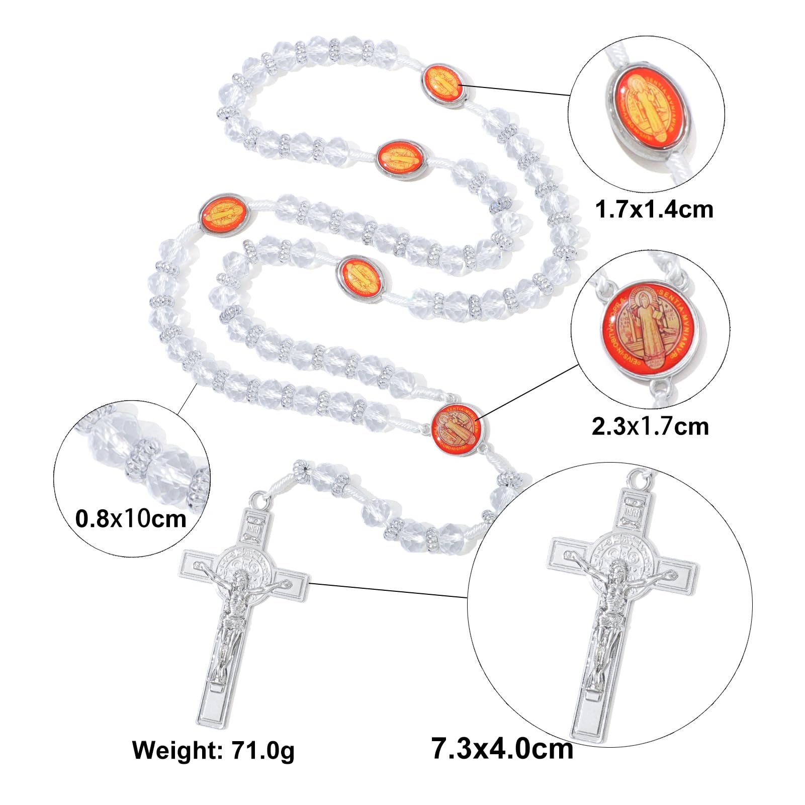 10mm facted white clear crystal beads rosary catholic necklace with Saint Benedict medal and Jesus crucifix cross.