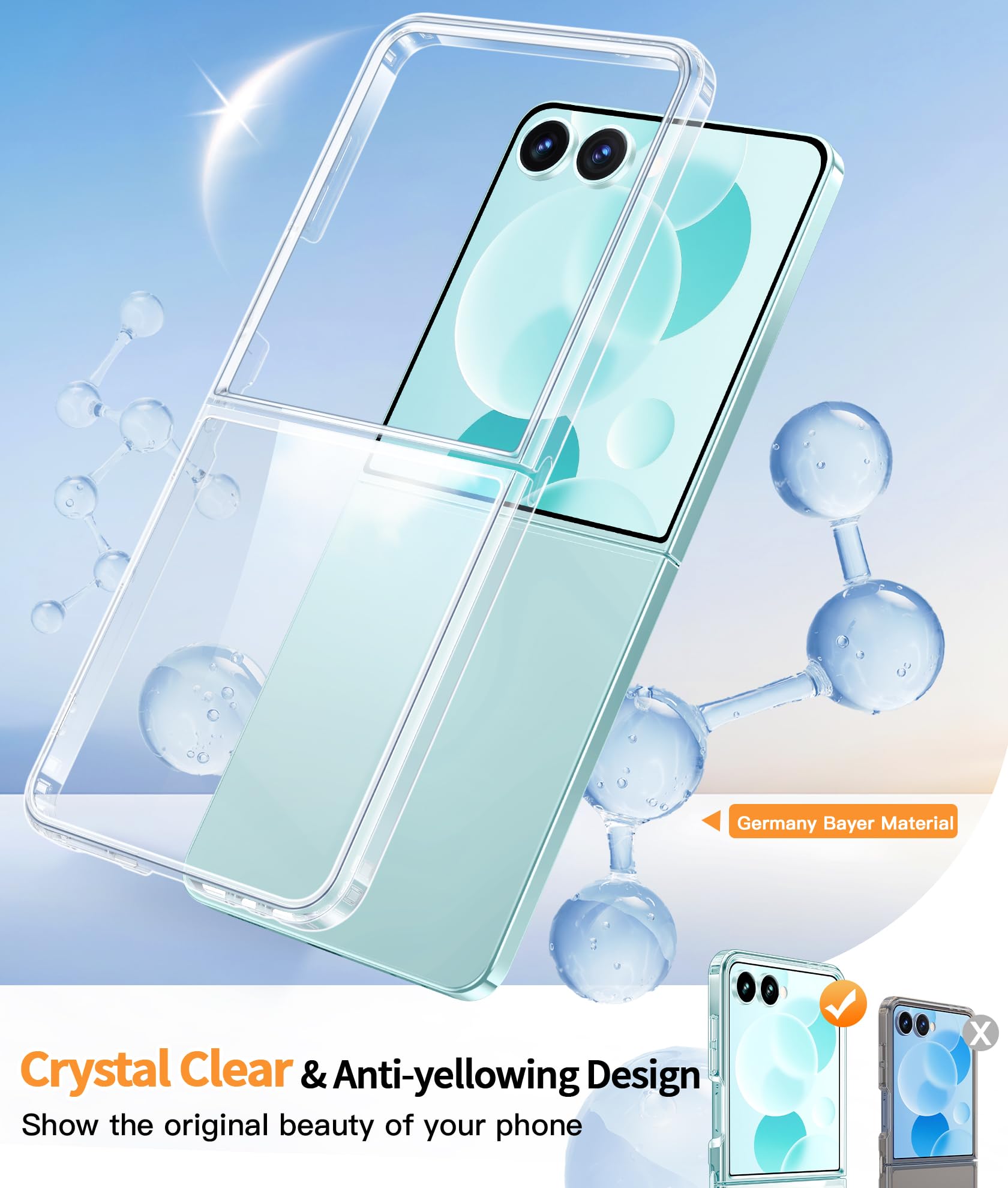 Crystal Clear & Never Yellow: Using high-grade Bayer's ultra-clear TPU and PC material, allowing you to admire the original sublime beauty for Samsung Galaxy Z Flip 7 while won't get oily when used. The Nano antioxidant layer effectively resists stains and sweat