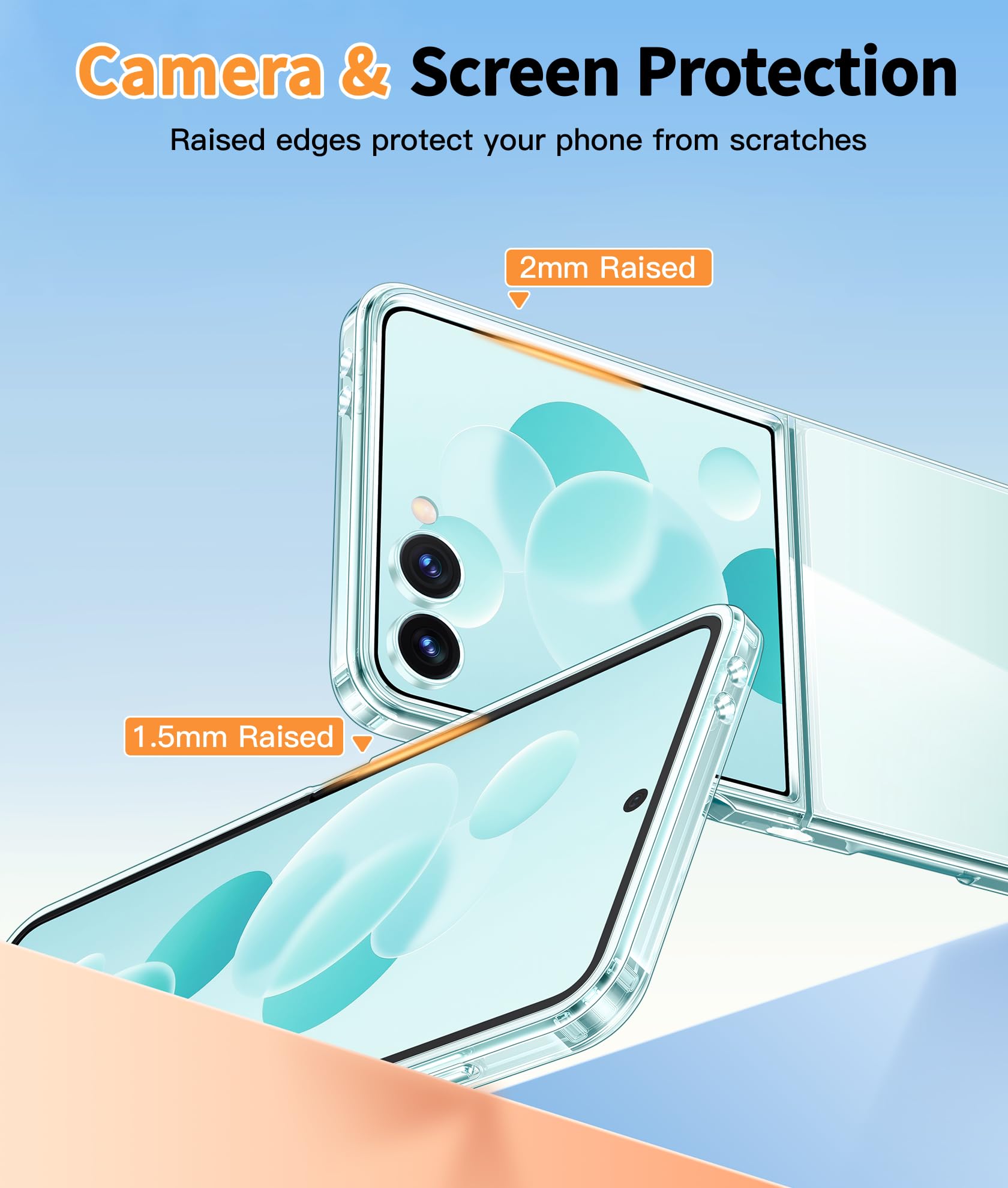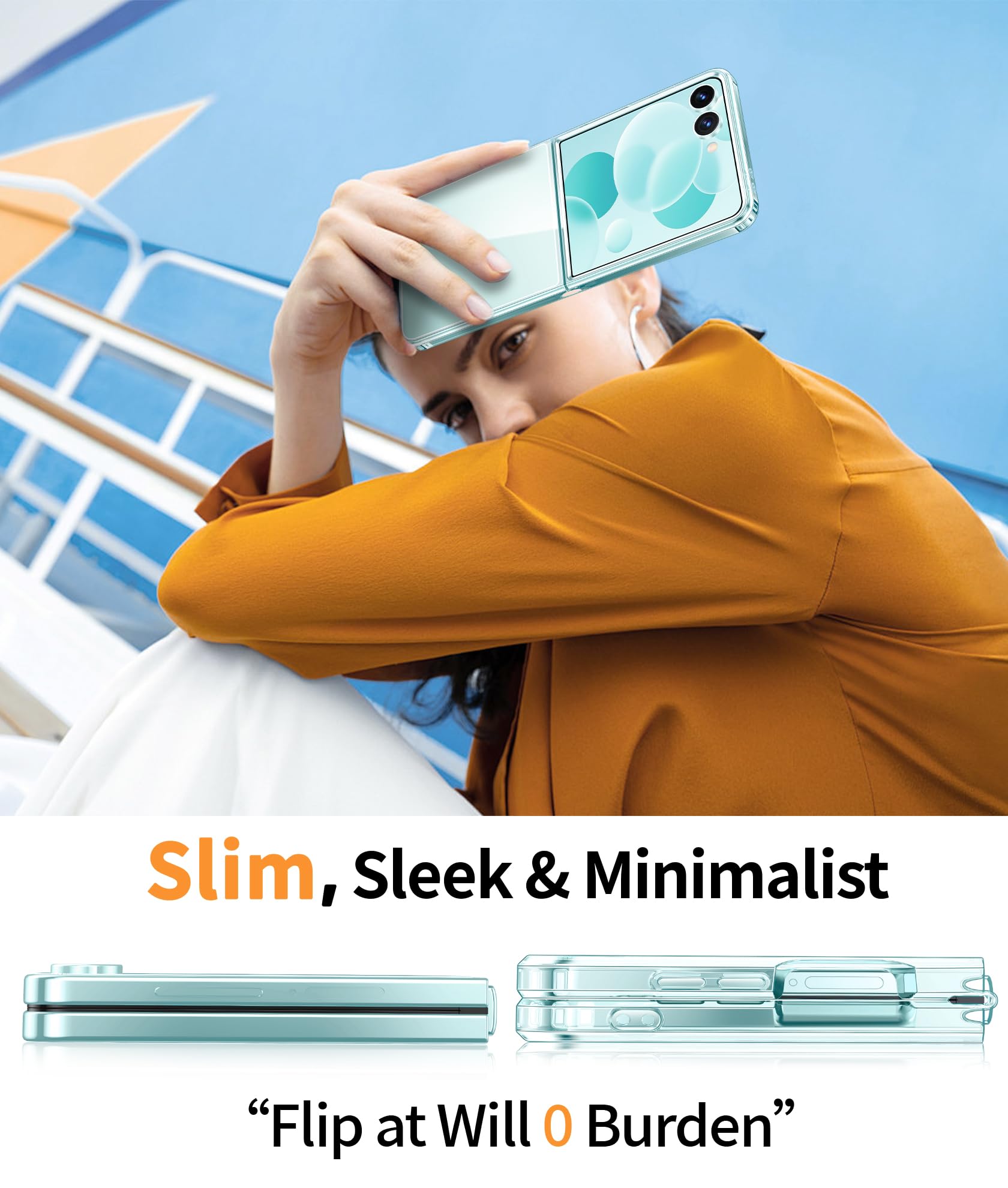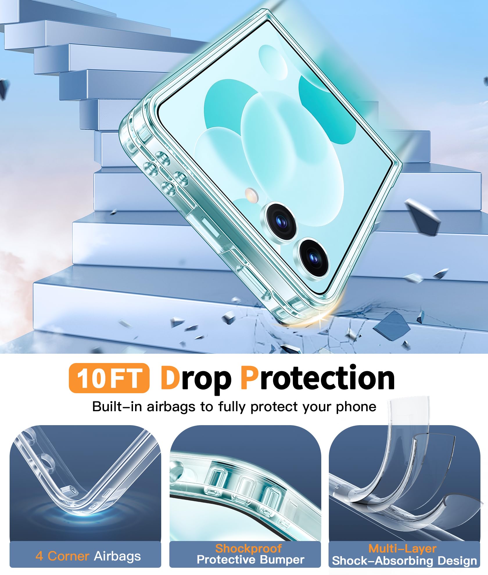 10FT Military Grade Protection: Passed Military Drop Tested up to 10 FT. This Samsung Galaxy Z Flip 7 clear case backplane is made with rigid polycarbonate and flexible shockproof TPU bumpers around the edge and features 4 built-in corner Airbags to absorb impact