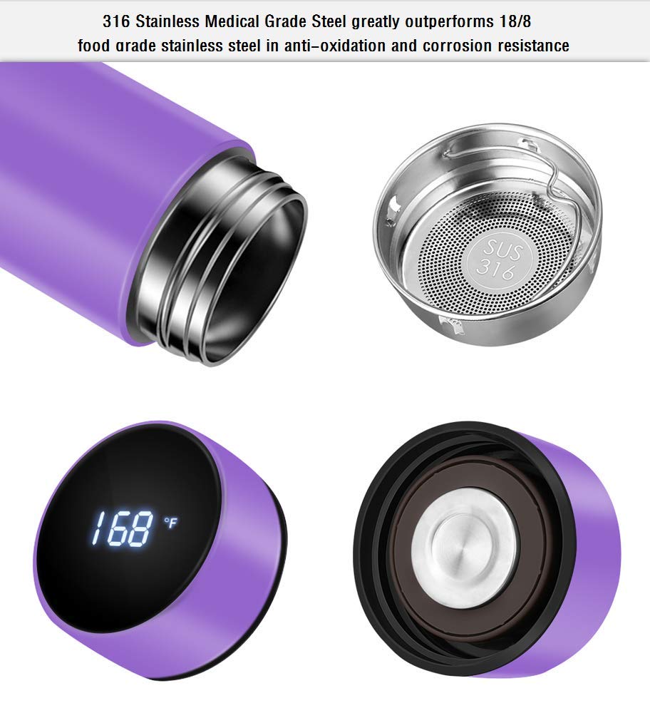 316 Stainless Medical Grade Steel----Insulated Water Bottle greatly outperforms 18/8 food grade stainless steel in anti-oxidation and corrosion resistance, it will never leave a metal taste or rust. Avoid the taste of the liquids to change (like tea, coffee and juice).
