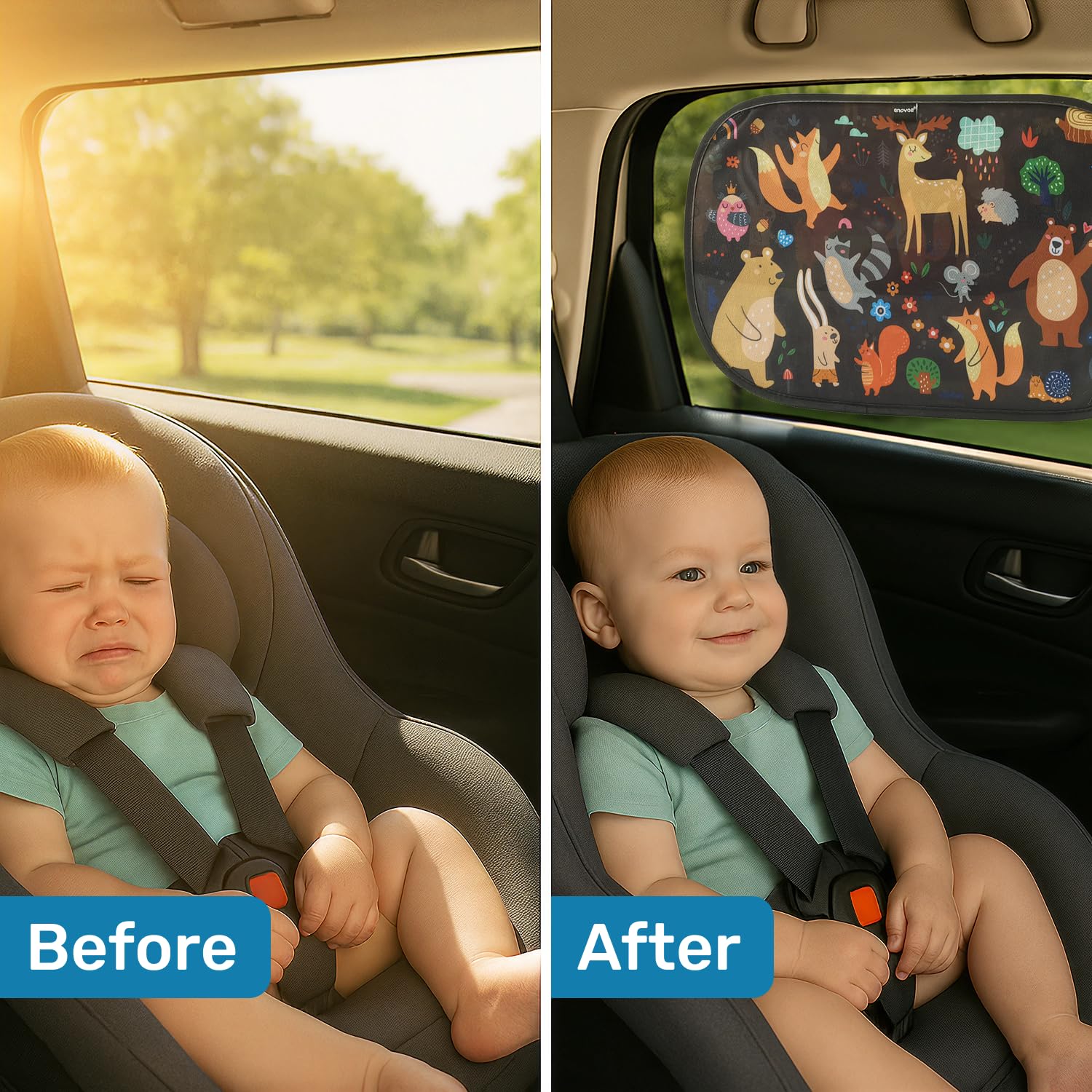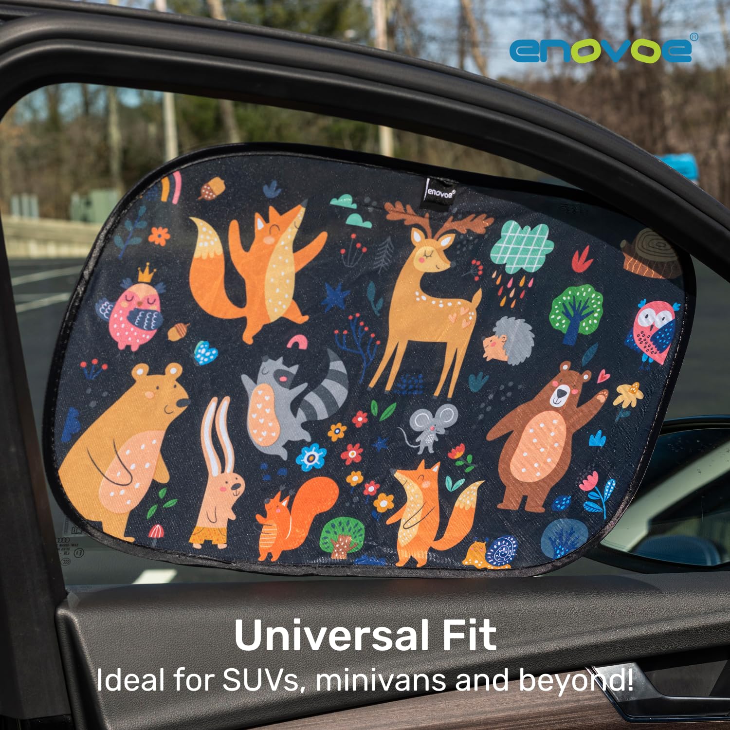 Fits Most Cars: Carton design kids car shade comes in a pack of 2 with size 21x14-inch; these Car Sun blockers are designed to fit larger car side windows of SUVs, minivans and full size cars; our sun shade is a breeze to install; Simply, place the Envoe shade on your side windows and run your hand across it