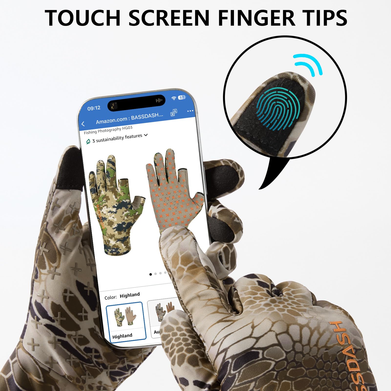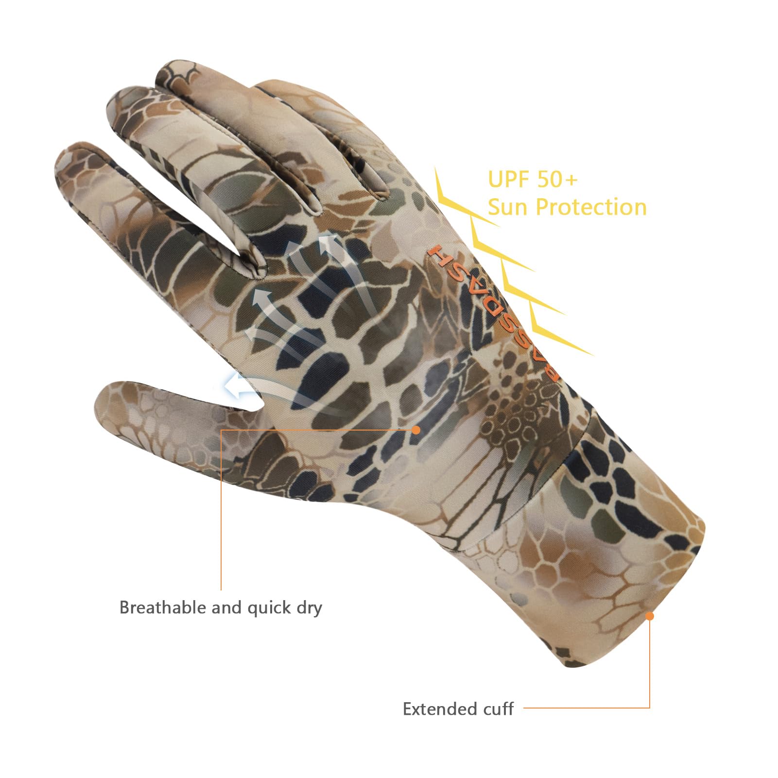 Description BASSDASH Men’s Camo Hunting Gloves UPF 50+ Lightweight Touchscreen Gloves for Warm Weather Fishing Hiking Outdoor Activities HG01M