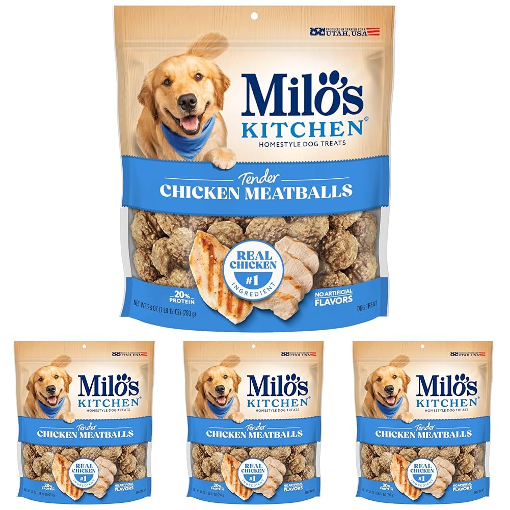 Contains one (1) 28-oz. bag of Milo’s Kitchen Chicken Meatballs dog treats