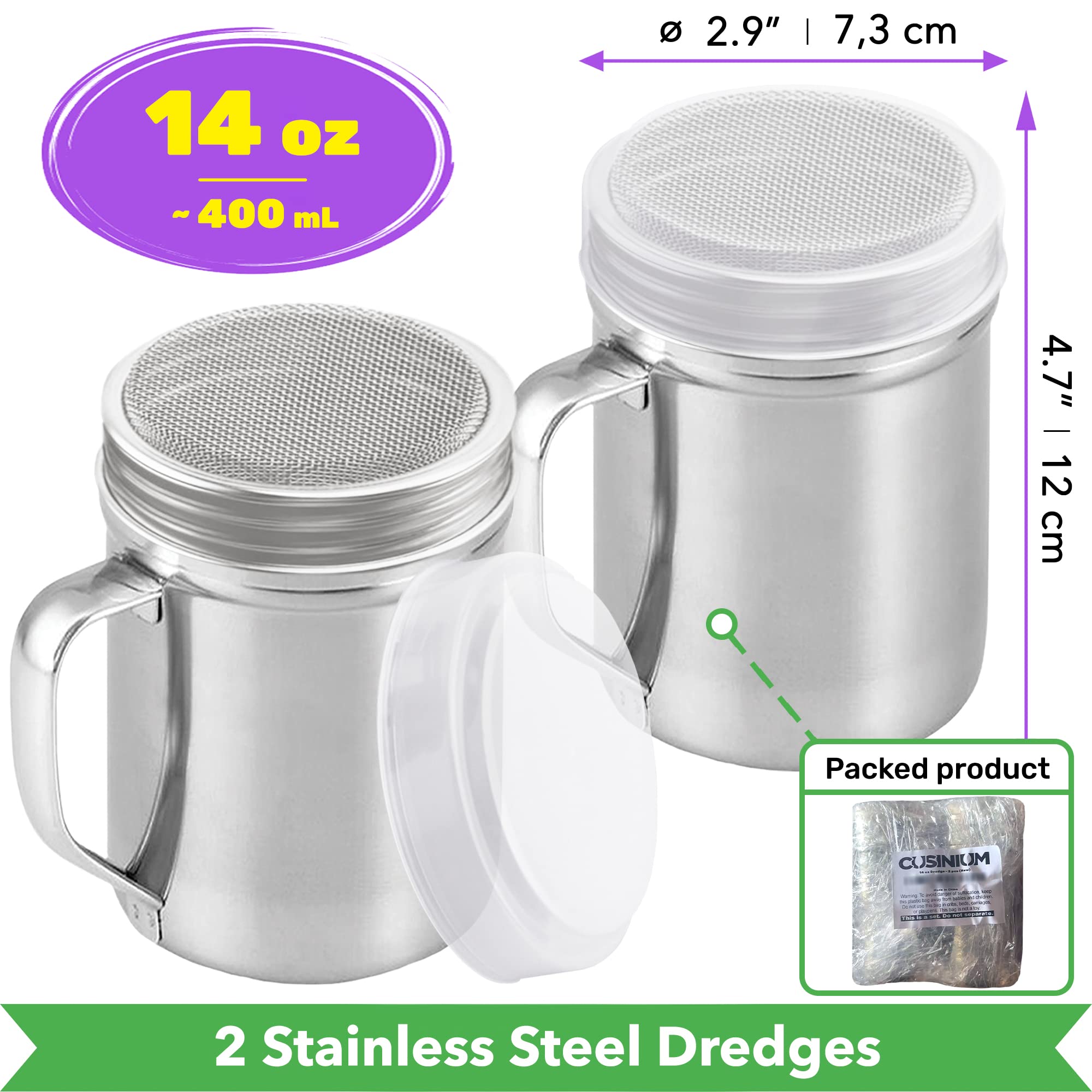 You will receive two large stainless steel dredges (14 oz) with handles, twist-off lids, and plastic caps