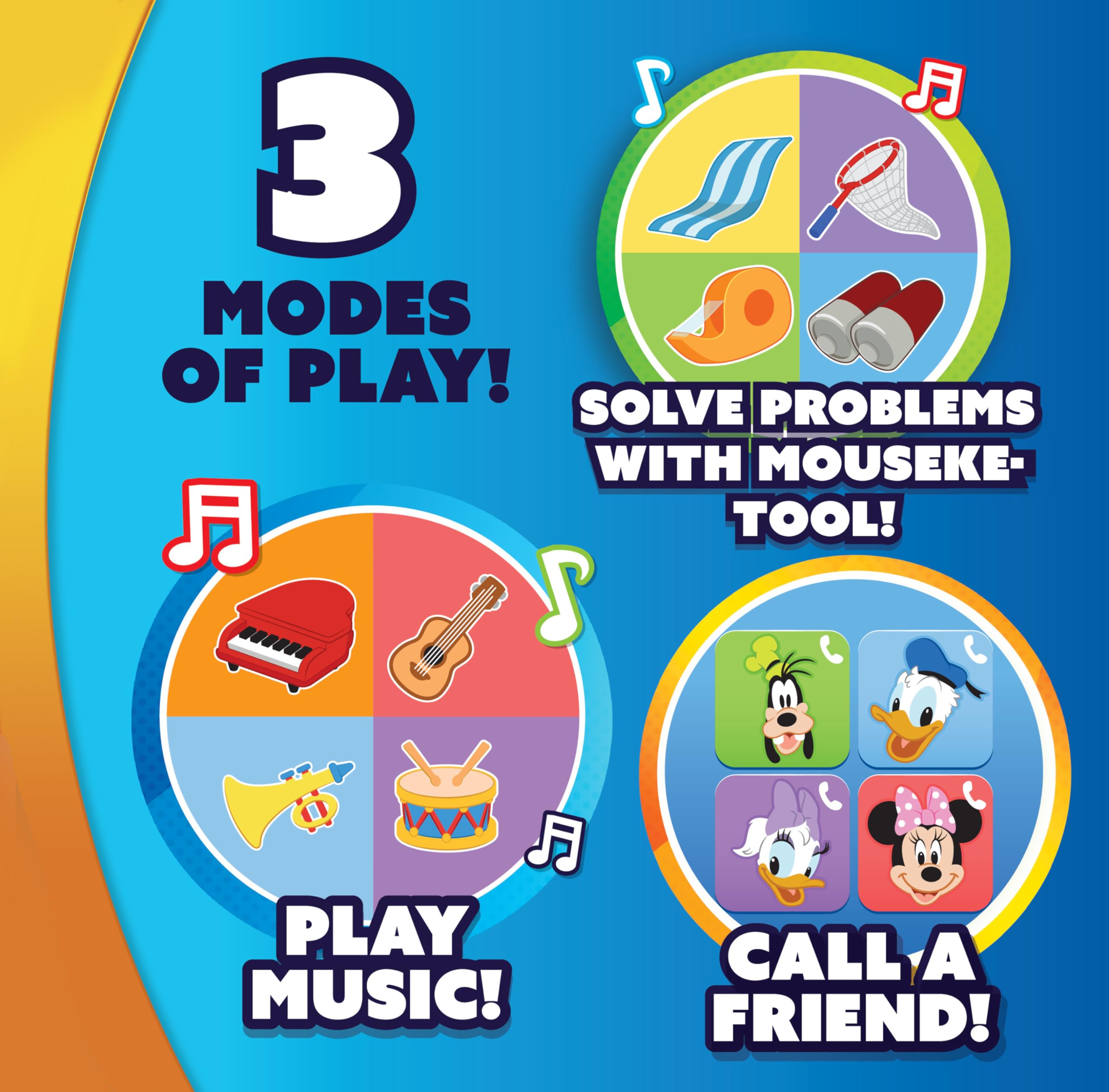 3 Ways to Play: Press Mickey Mouse’s left foot to choose a play mode. Then, explore Mouseketools, Music, and Call a Friend modes.