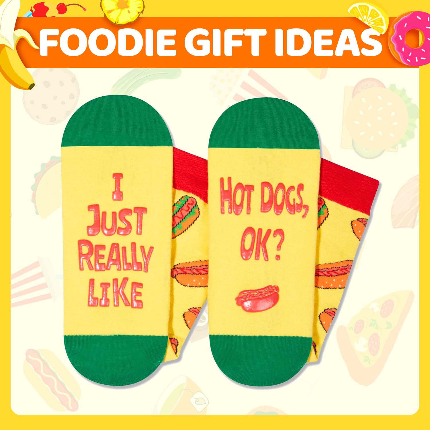 HOT DOG SOCKS: These hotdog socks feature hot dogs at the top. At the bottom, there is a funny saying, "I JUST REALLY LIKE HOT DOGS, OK?".