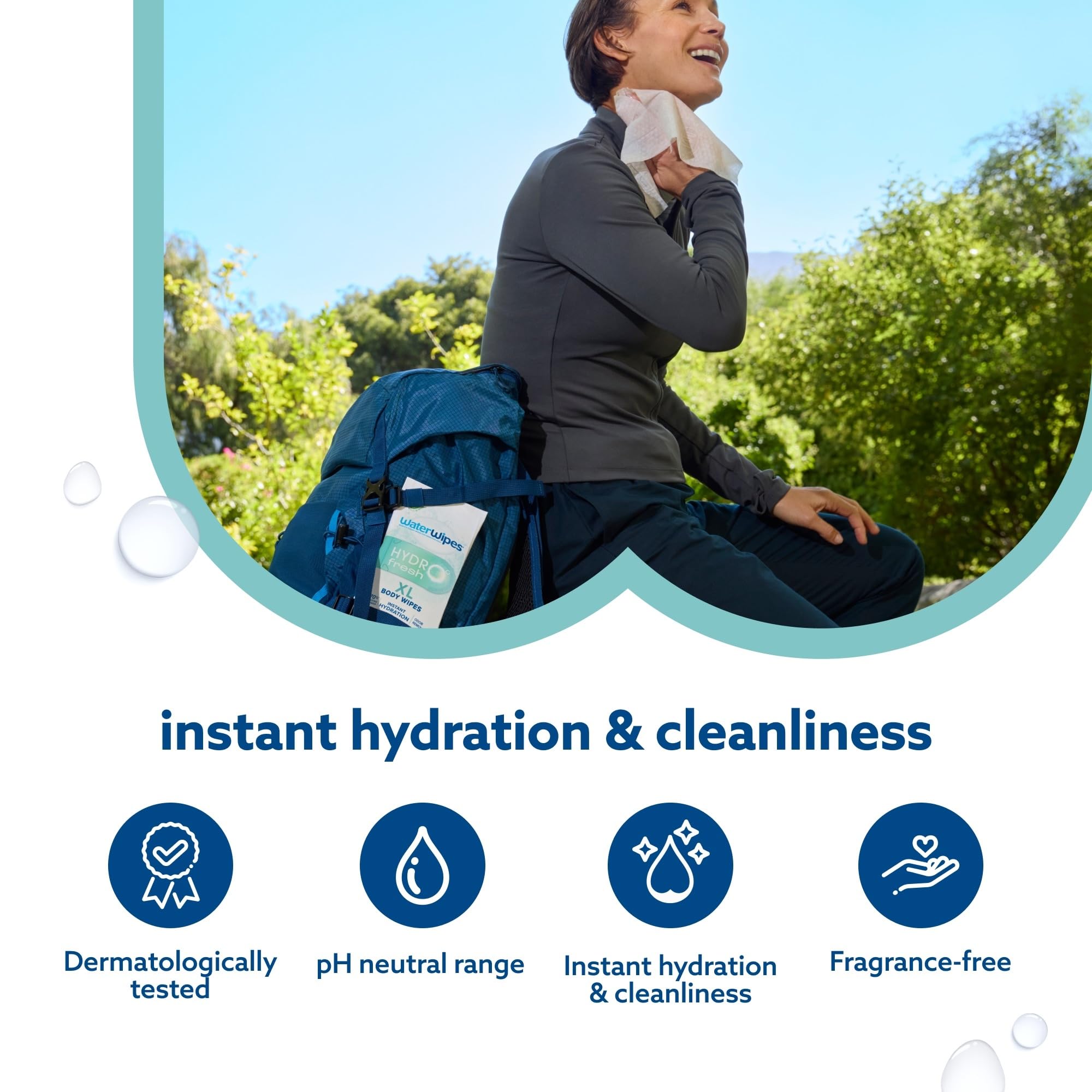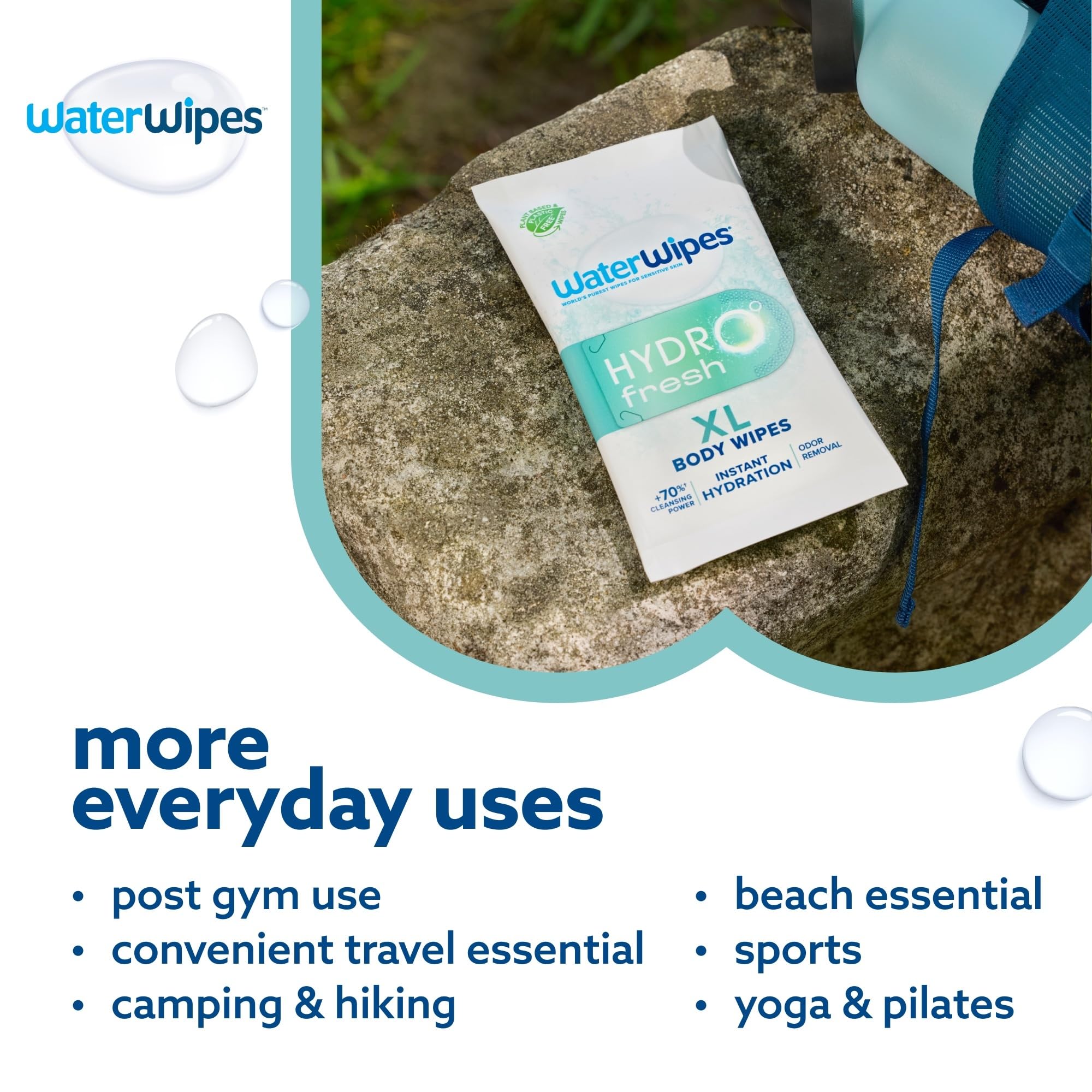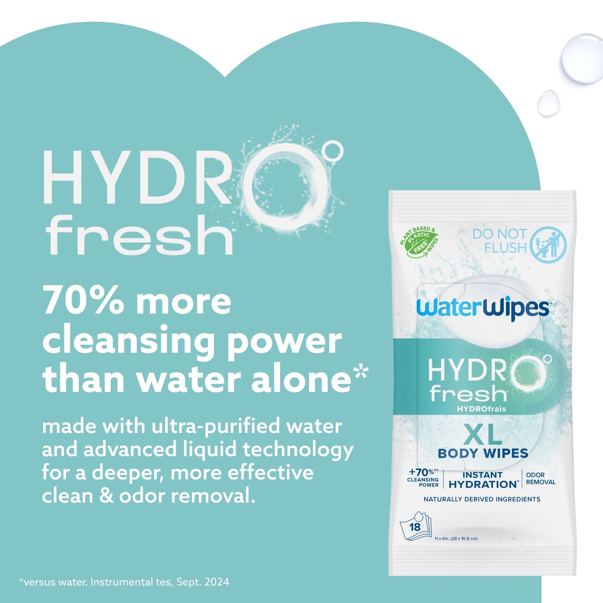 Stay clean, confident, and refreshed wherever life takes you with WaterWipes HydroFresh Refresh Wipes, 108 Count (6 Pack). These extra-large body wipes are designed to deliver instant cleanliness and odor control, so you can feel shower-fresh anytime, anywhere. Our advanced formula features ultra-purified water with over 70% more cleansing power* than water alone, plus naturally derived ingredients like Aloe Vera, Saccharomyces, and Soapwort to help cleanse your skin. Whether you're freshening up after a workout, during travel, or between busy days, HydroFresh wipes are your go-to for feeling clean while hydrating your skin**. Our wipes are dermatologically tested, and extra gentle for daily use, yet powerful enough to tackle odor for up to 4 hours. Created to meet the needs of modern life, WaterWipes HydroFresh helps you care for your skin with the same simplicity, purity, and confidence you’ve come to expect from WaterWipes. Because feeling fresh should always be this easy. **versus water *Instrumental test, 10 participants, September 2024
