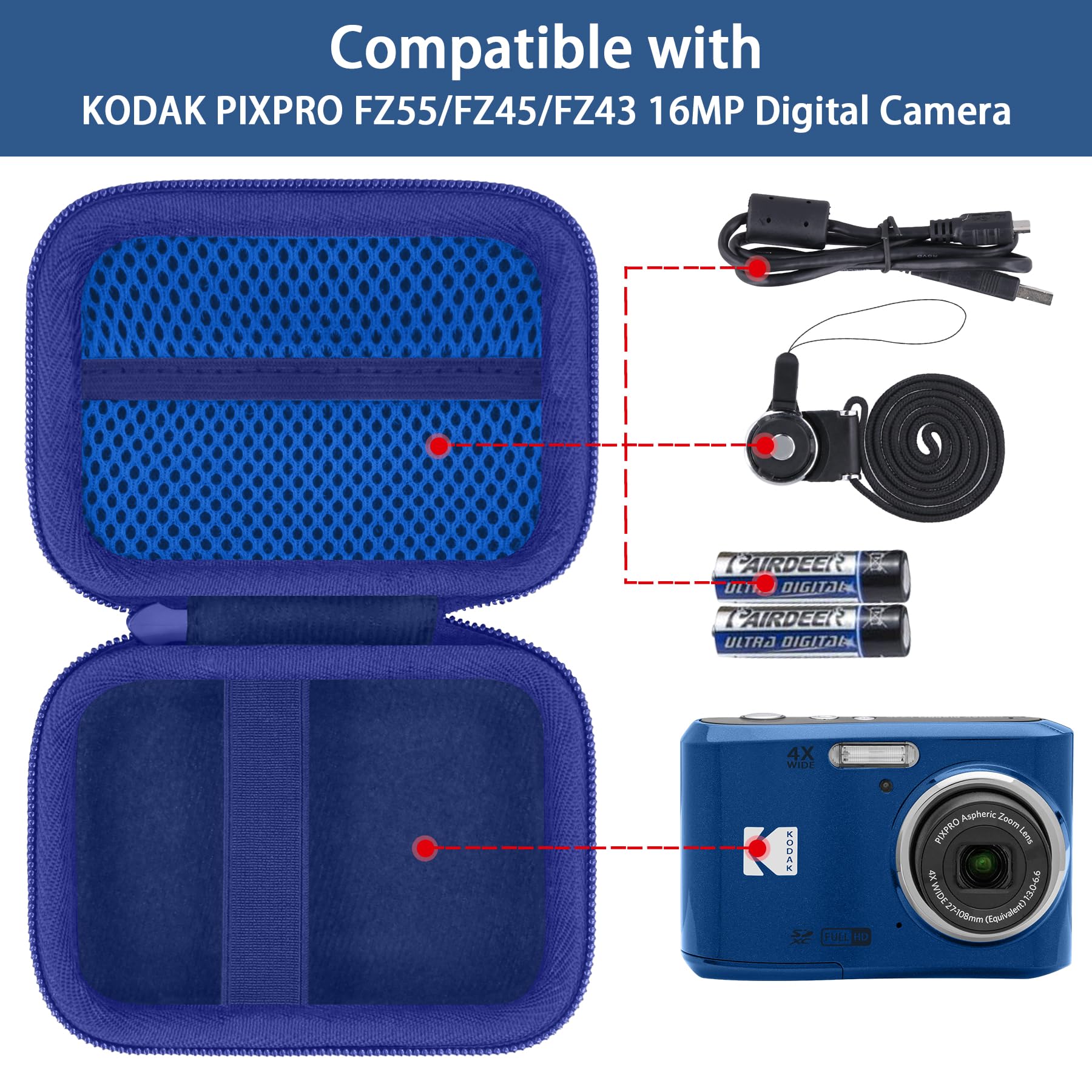 Soft Interior: The Kodak PIXPRO FZ43-BK 16MP Digital Camera protective case features a soft velvet interior that prevents scratches and wear on the Kodak FZ43 Camera, providing dual protection for your kodak pixpro fz43 camera. The kodak digital camera pixpro fz43 storage case is covered with a mesh pocket for easy storage of kodak pixpro fz43 accessories. Meanwhile, the Kodak FZ43 camera case comes with an elastic band that can secure the kodak digital camera pixpro fz43 inside the case.