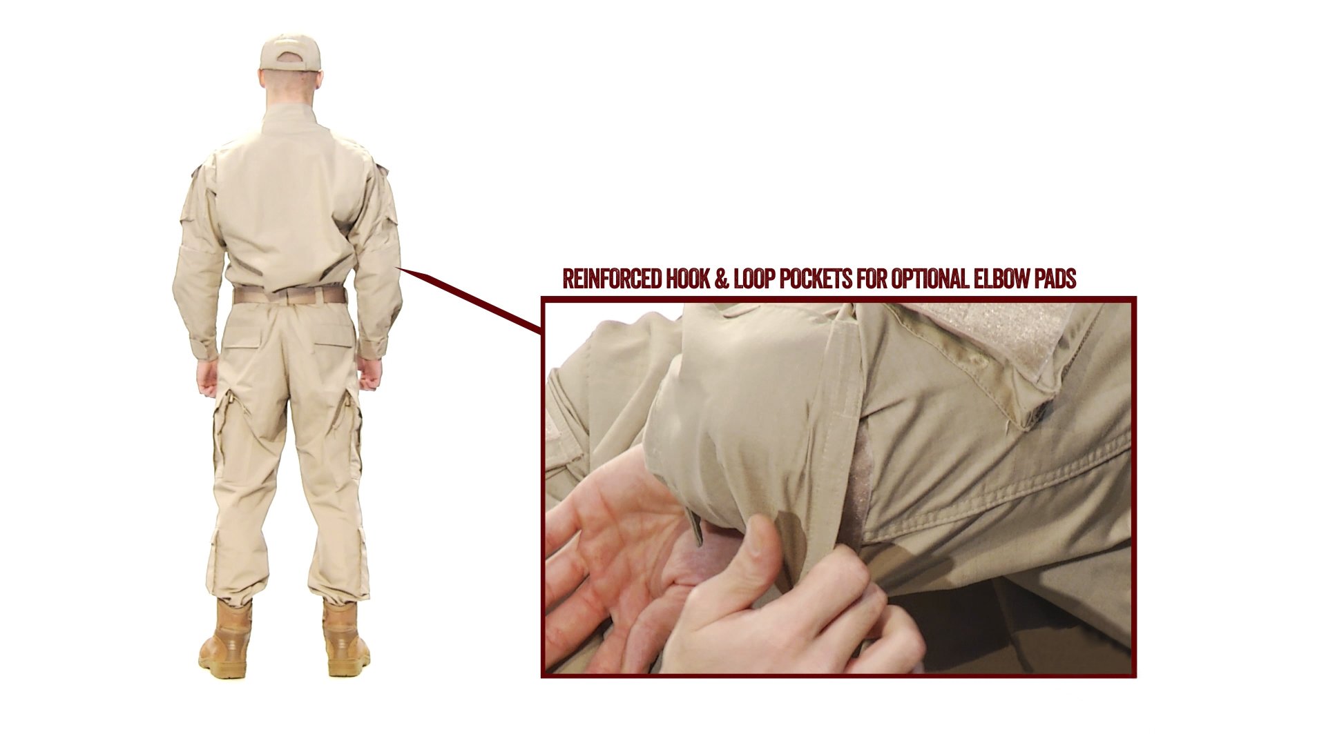 Reinforced external elbow pockets with external openings for elbow pads secured with hook & loop (elbow pads not included)