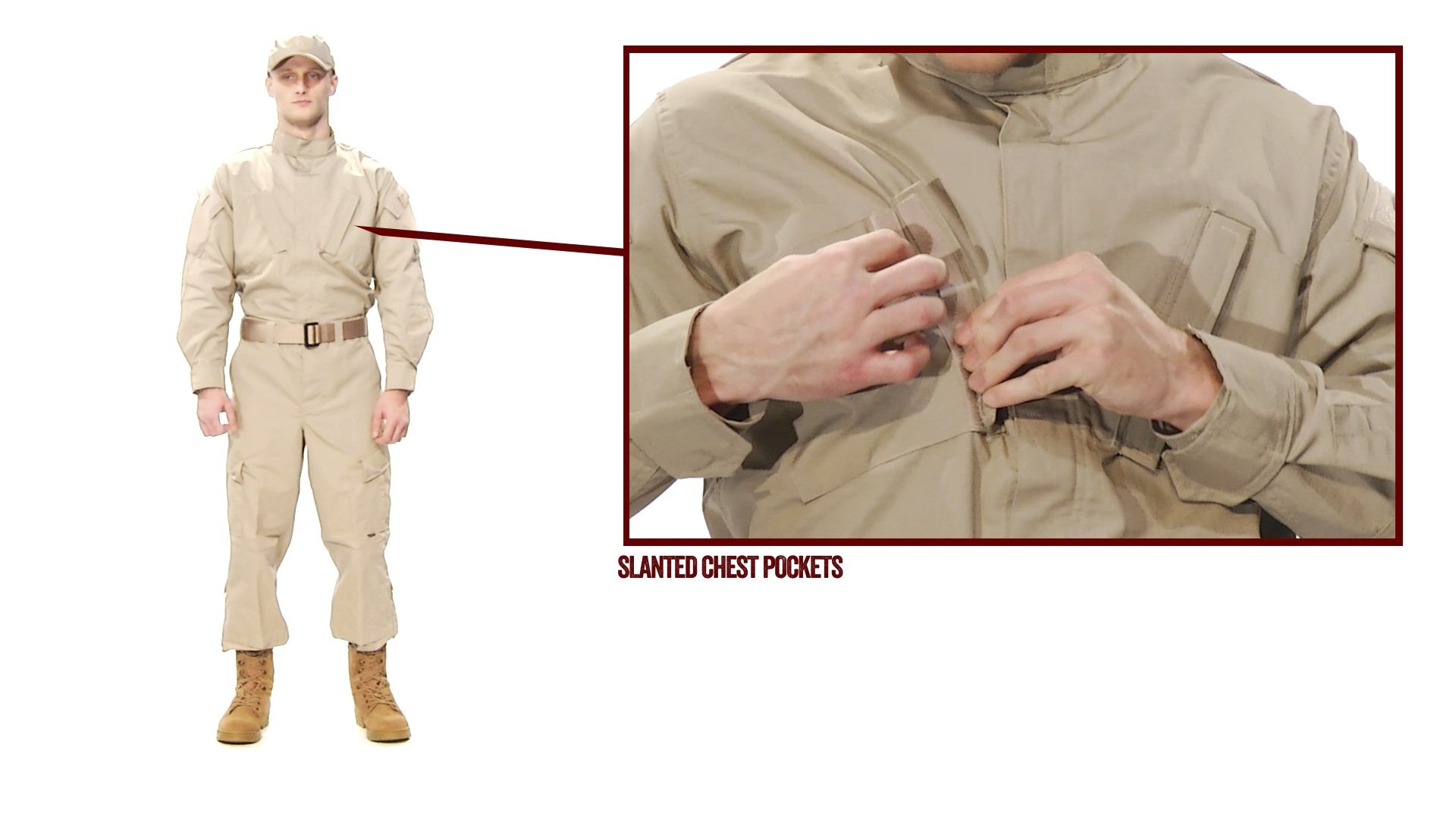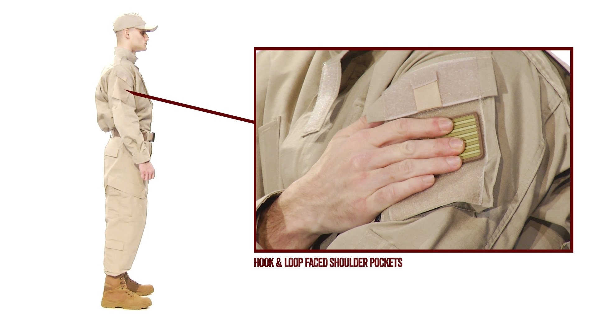 Hook & loop faced shoulder pockets for patches & skill tabs. Also includes 3-pieces of hook & loop that can be sewn on for name and rank patches
