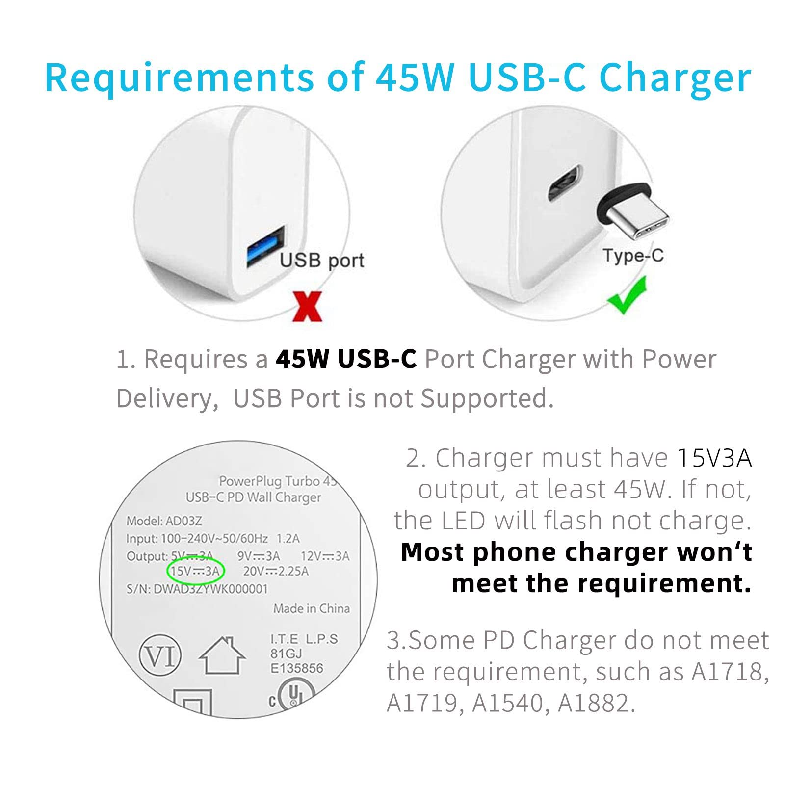 Requirement: This SISYPHY Surface charging cable requires an USB-C charger or charging bank which support 45W (or more) and 15V3A output. Doublecheck your USBC charger to ensure that it lists "15V/3A" in the specifications. Some PD chargers didn't support the cable.