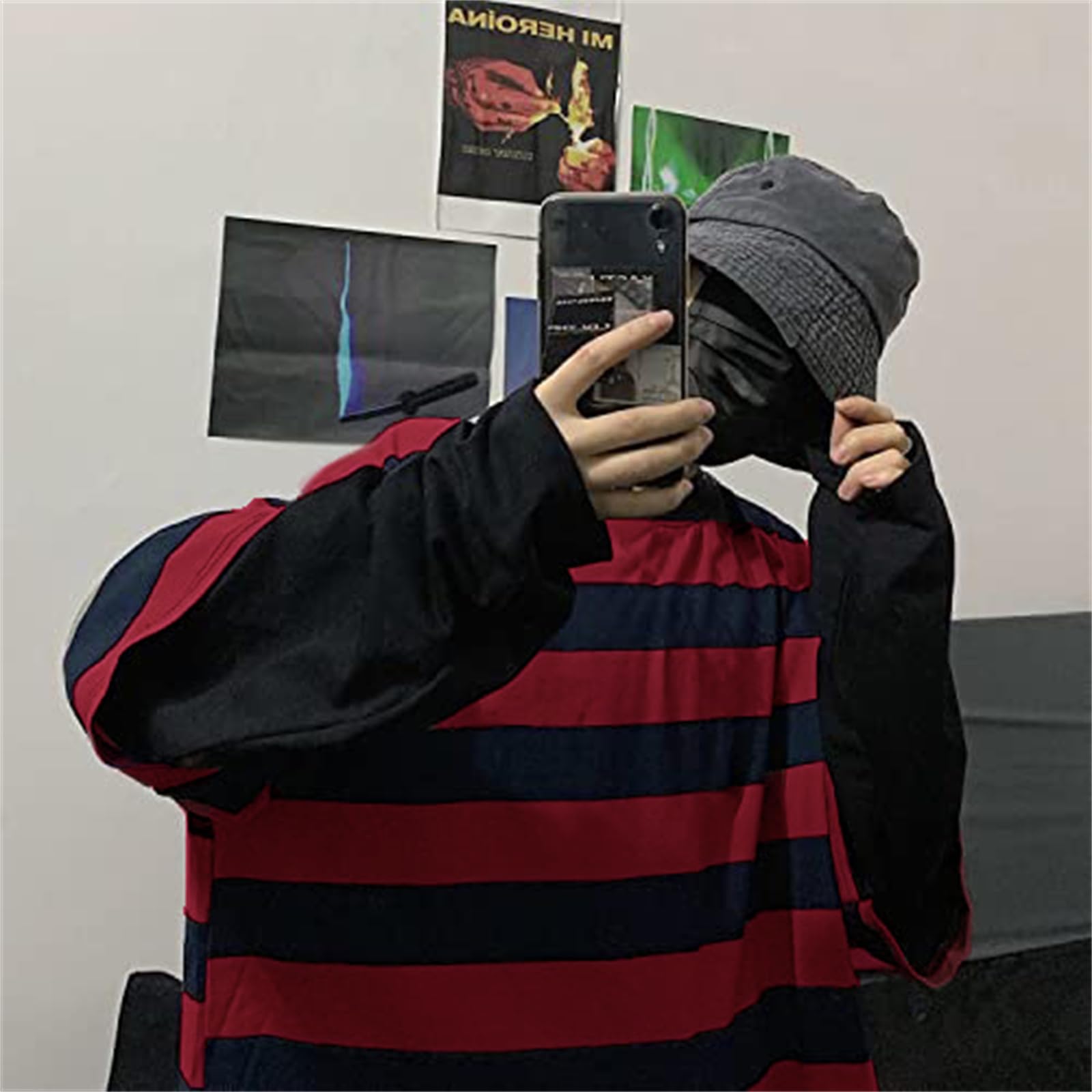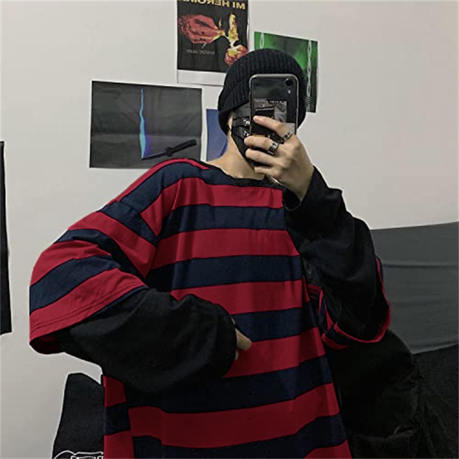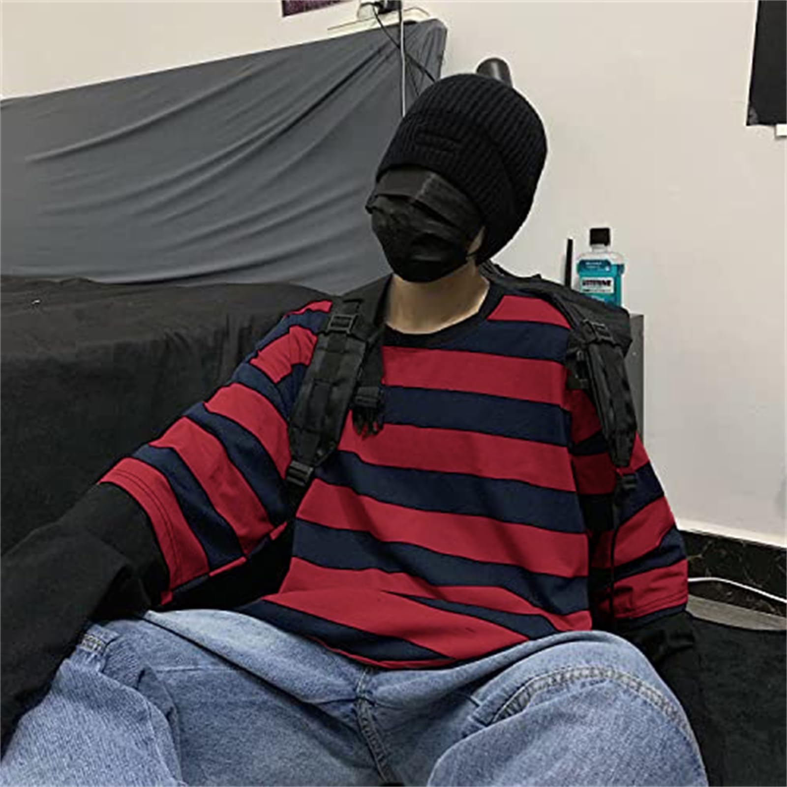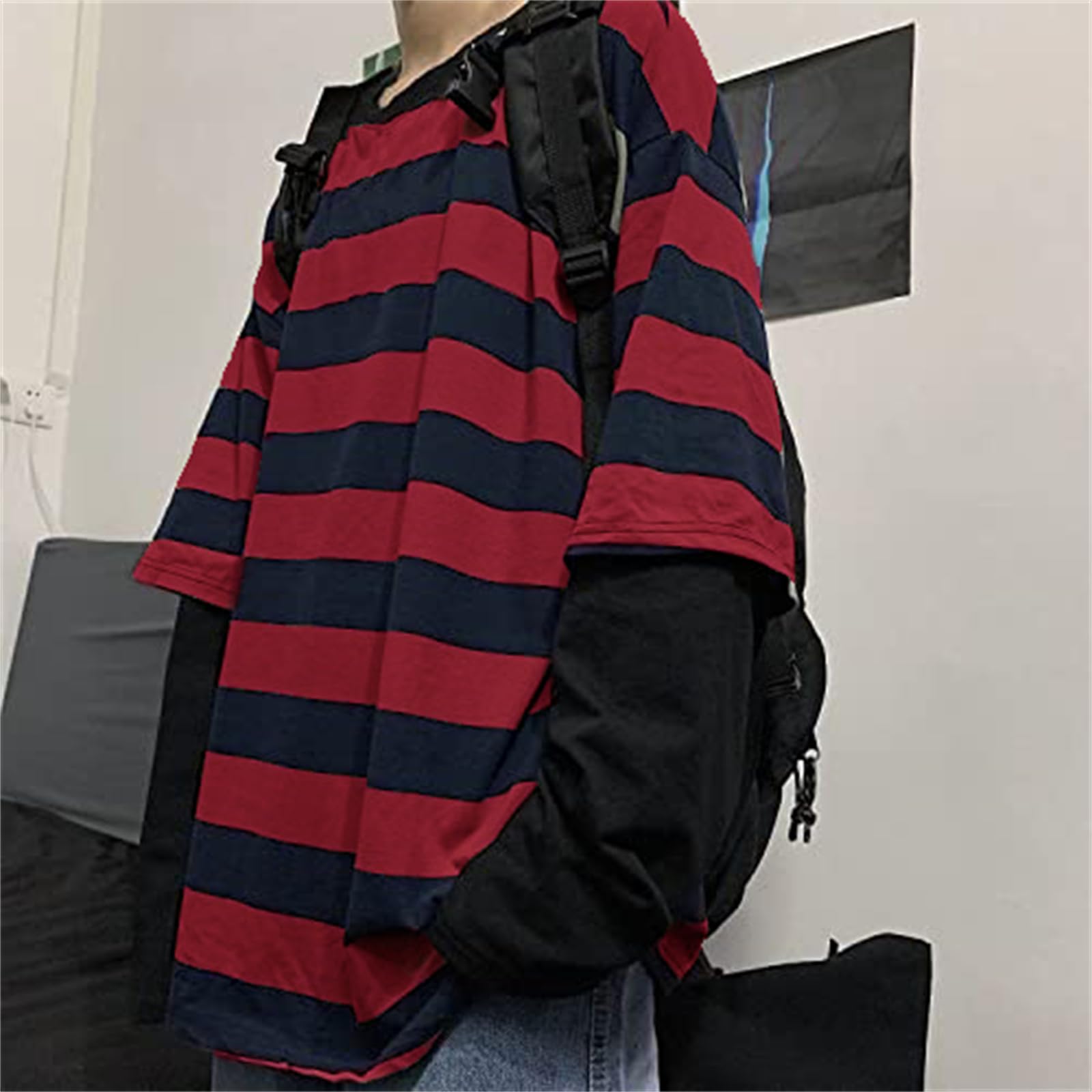 Features: This gothic pullover is designed with a round neck, stripes, short sleeves, fake two-piece design, casual loose, urban style, hip-hop style, fashionable style, unisex top, suitable for men and women.