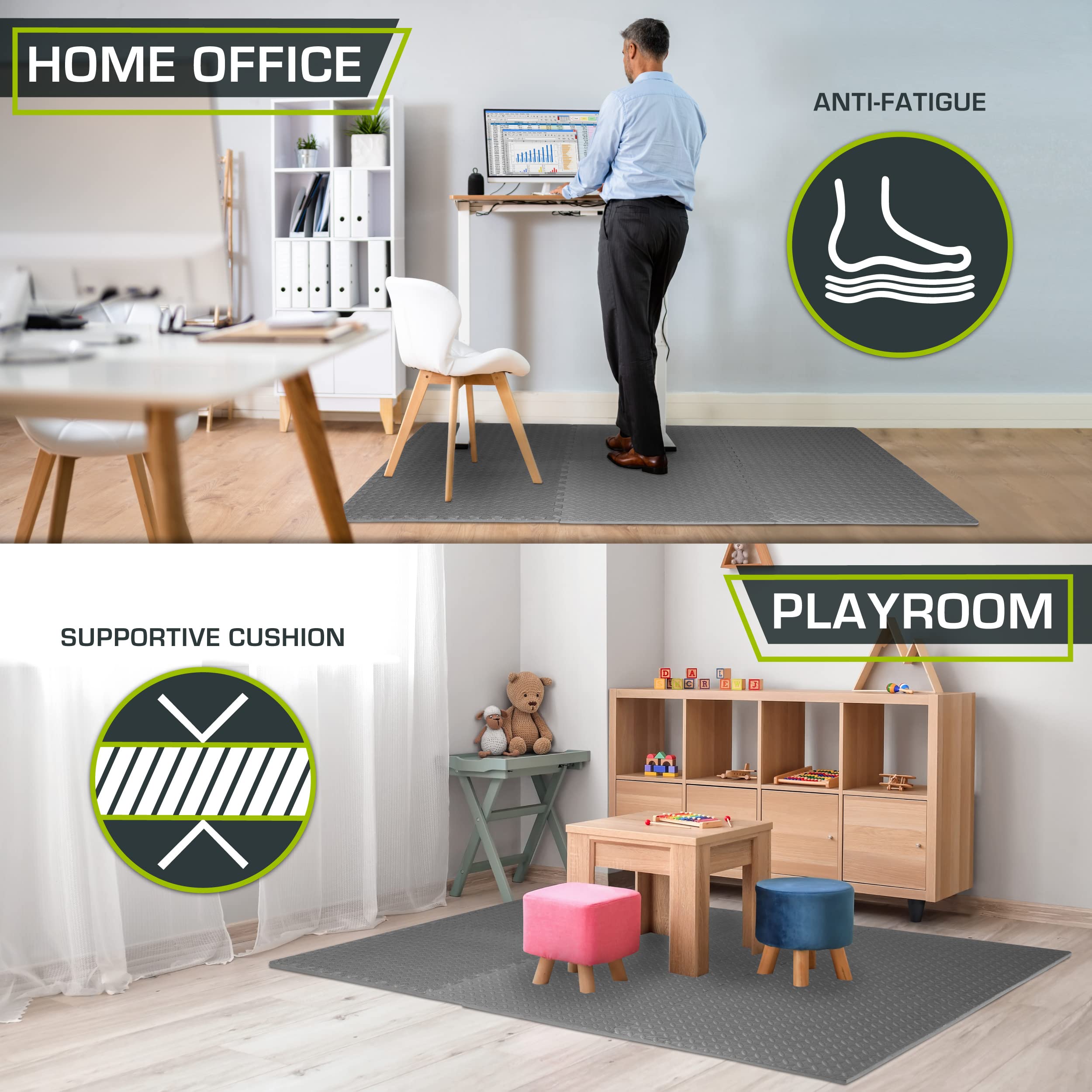 VERSATILE: The water-resistant, noise-reducing design is easy to clean, great for indoor purposes including your garage floor mat, carpet tiles protector, gyms, a home fitness room, and more; Best results on flat, hard surfaces