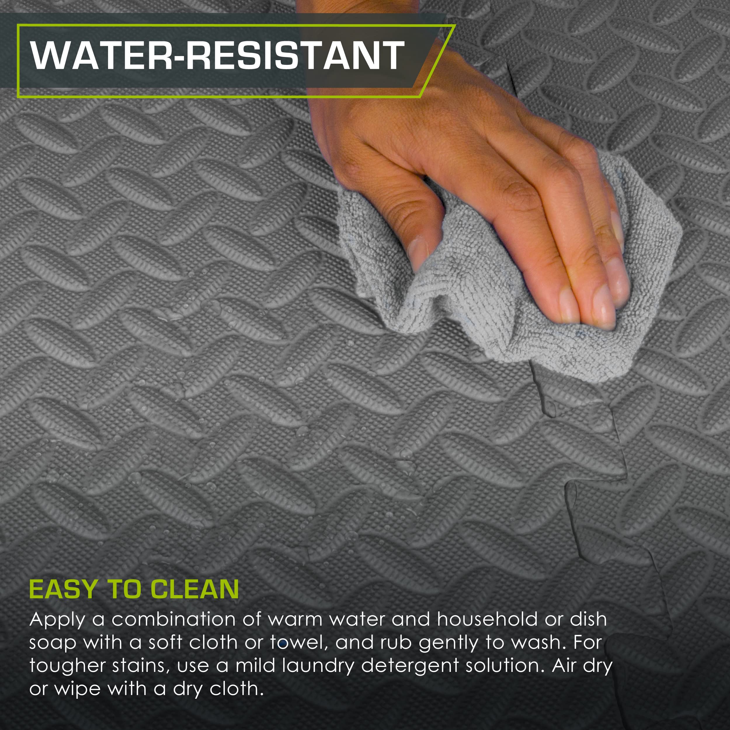 COVERS 144 SQ FT: Each tile measures 24 in x 24 in x Β½ in - thick from the highest point of the texture; Includes 36 tiles with end borders for a polished look. Care: Apply warm water and dish soap with a soft cloth or towel and air dry