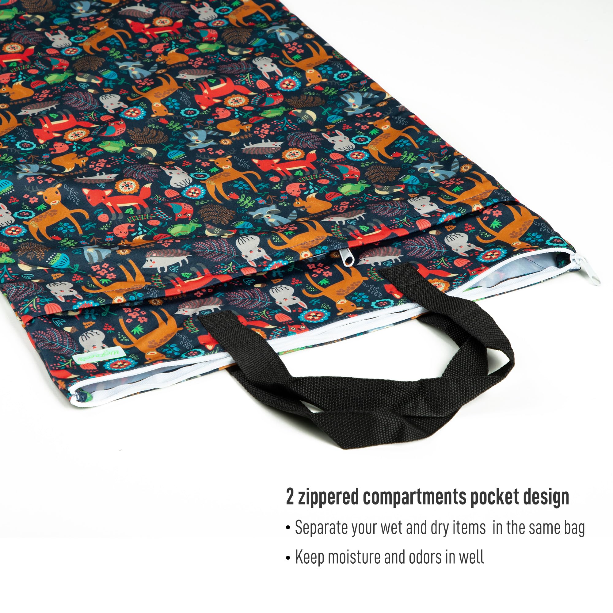 HANDLES & WET/DRY POCKET KEEPS MESSES IN - The sturdy nylon handles allows for easy hanging on a hook or doorknob and on daily carry. The two zippered compartments pocket design keep moisture and odors in well. The clean or dry items in the front "dry" zippered pocket and the dirty or wet items in the zippered "wet" section keeping moisture and odors in.