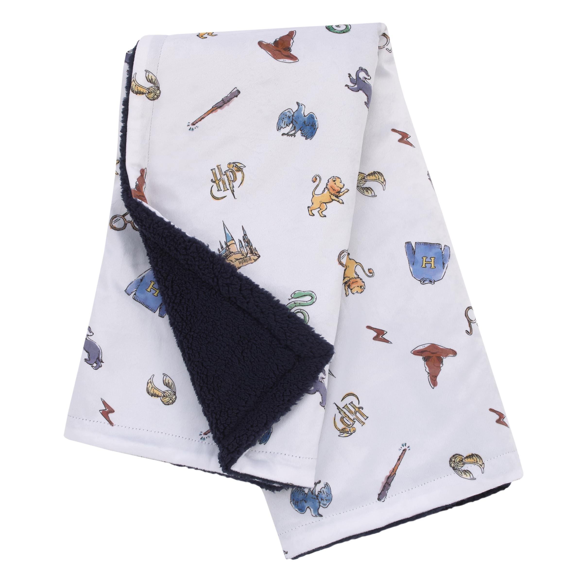 The Harry Potter Welcome Little Wizard Sherpa Baby Blanket features Harry's Wizarding World icons