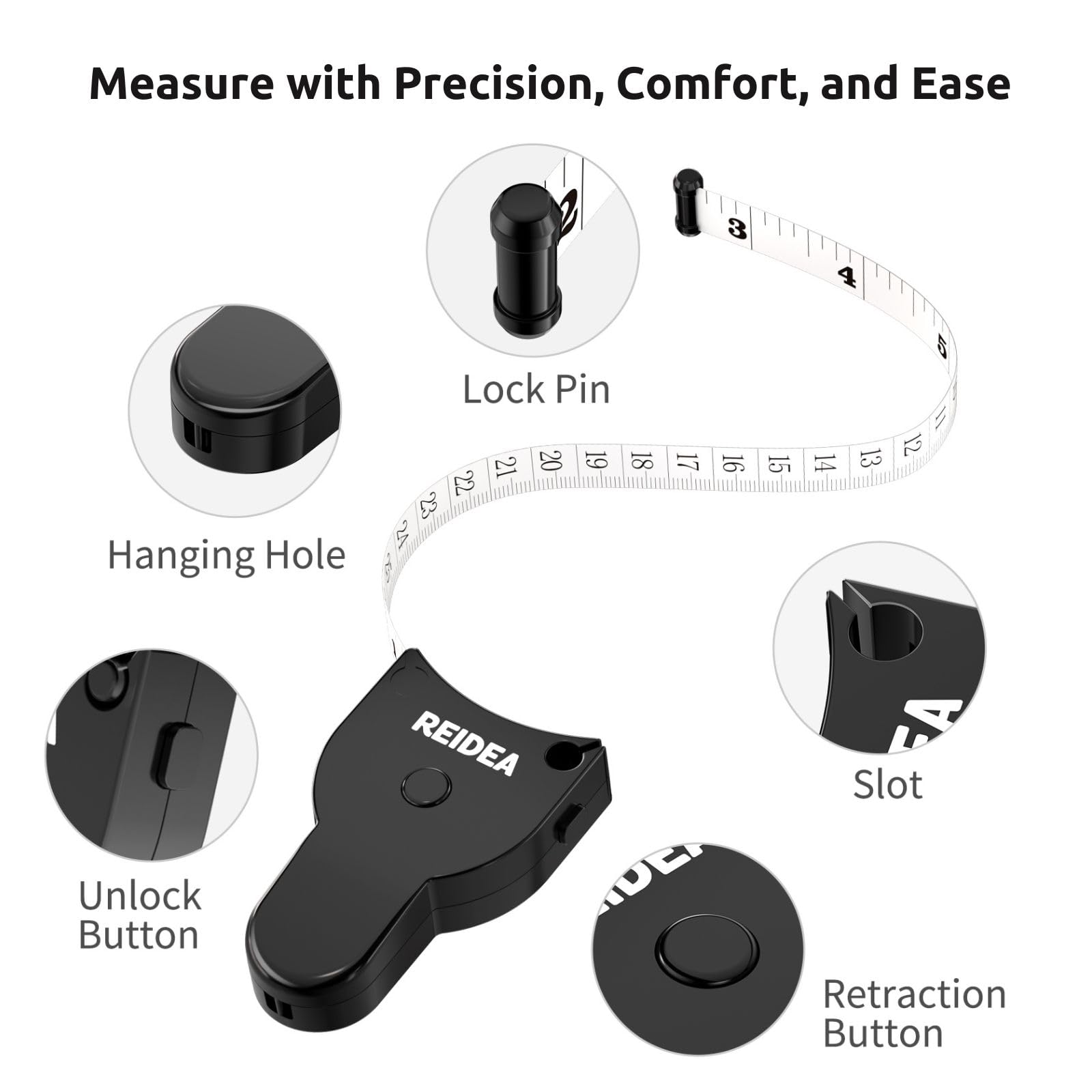 ๐Versatile Use: Perfect for measuring any body part - arm, thigh, calf, chest, waist, hips, etc., up to 60 inches/150 cm. The tape measure starts at 2 inches/5 cm to simplify your measuring process. Features a pin lock and push-button retraction for accurate measurements every time. Ideal for personal and professional use.