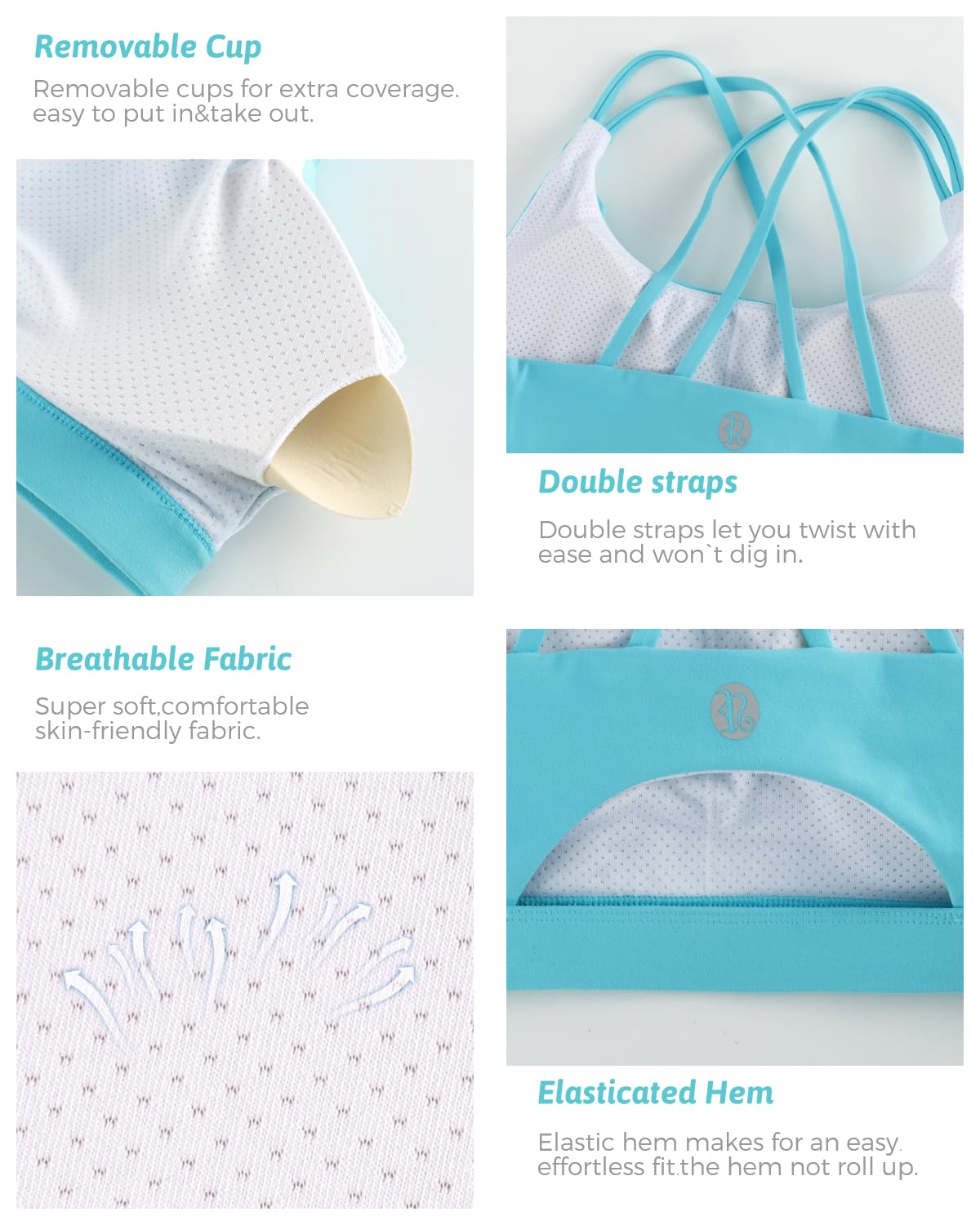 √YOUR SECURE FIT - Strappy design meets sporty style. Super soft scoop neckline with light, removable pads. Open cutout back styling sports bras for women medium support, widen band underneath the breast ensures a tight secure fit. Removable cups for extra coverage. The removable vertical cotton bra pads are easy to clean.The padded sports bra which always retains its shape and prevent bra bulges, caresses your figure to adjust to your curves.