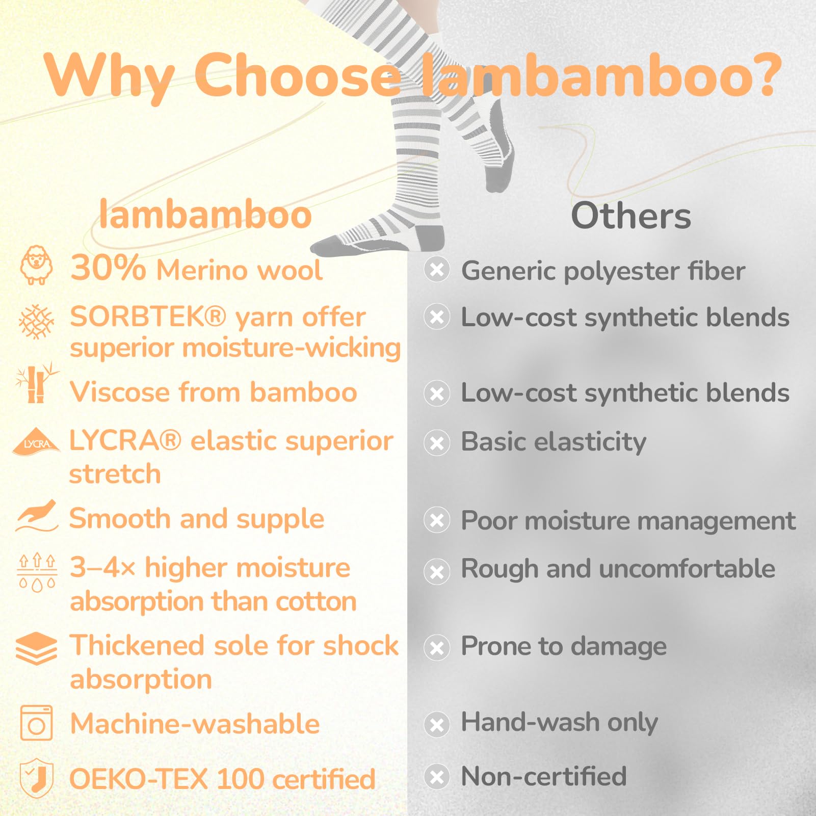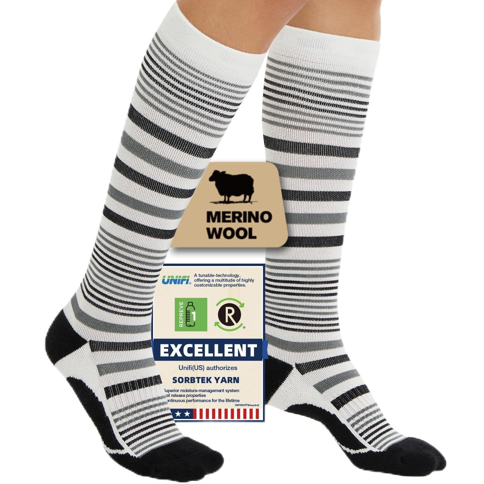 Ultra Soft & Breathable: The compression socks is made of MERINO WOOL & VISCOSE from BAMBOO, which is anti-odor, moisture-wicking, thermoregulating, breathable, ultra-soft, lightweight, perfect for all-season comfort. Arch Support assists in optimizing foot force, Seamless Toe Closure protect your toes
