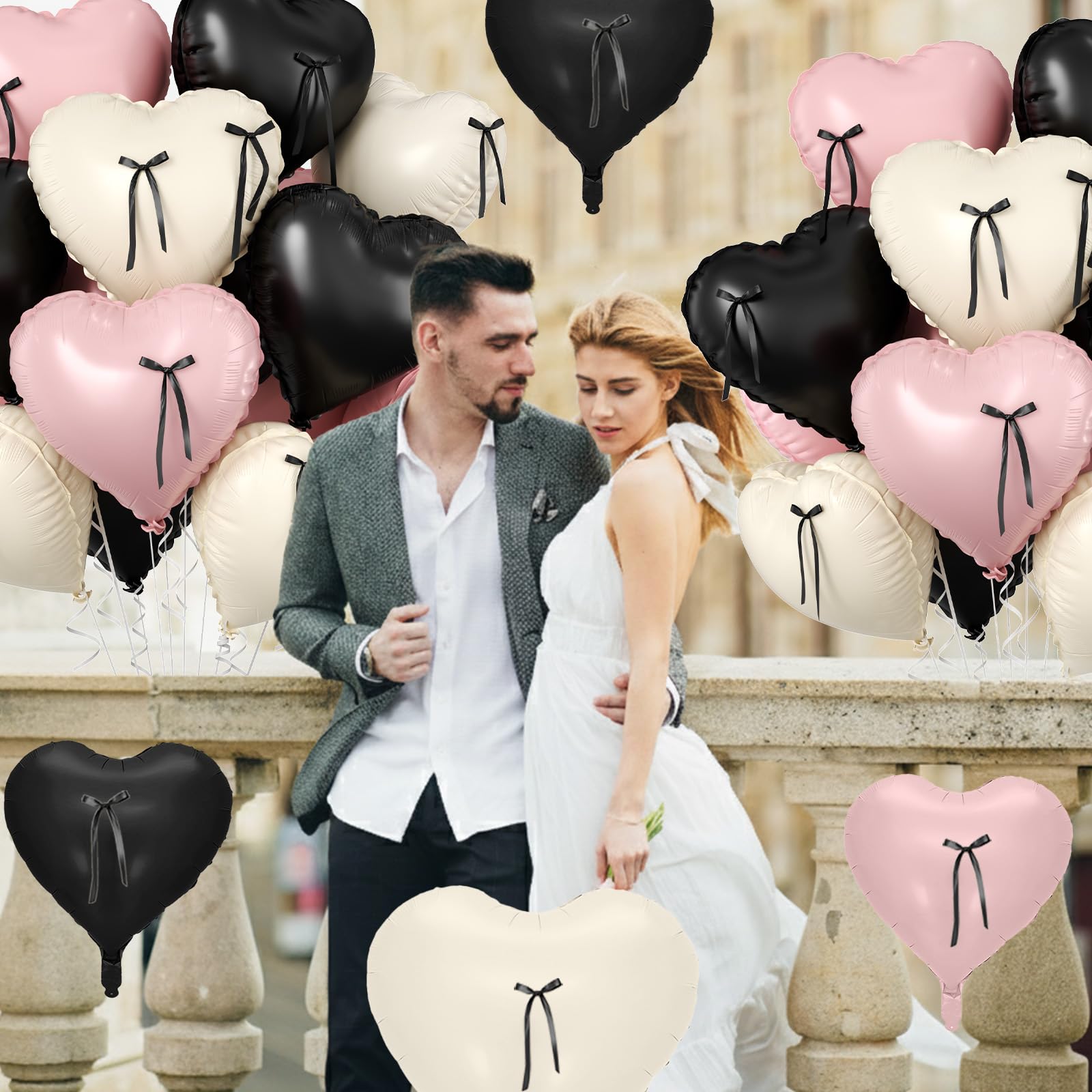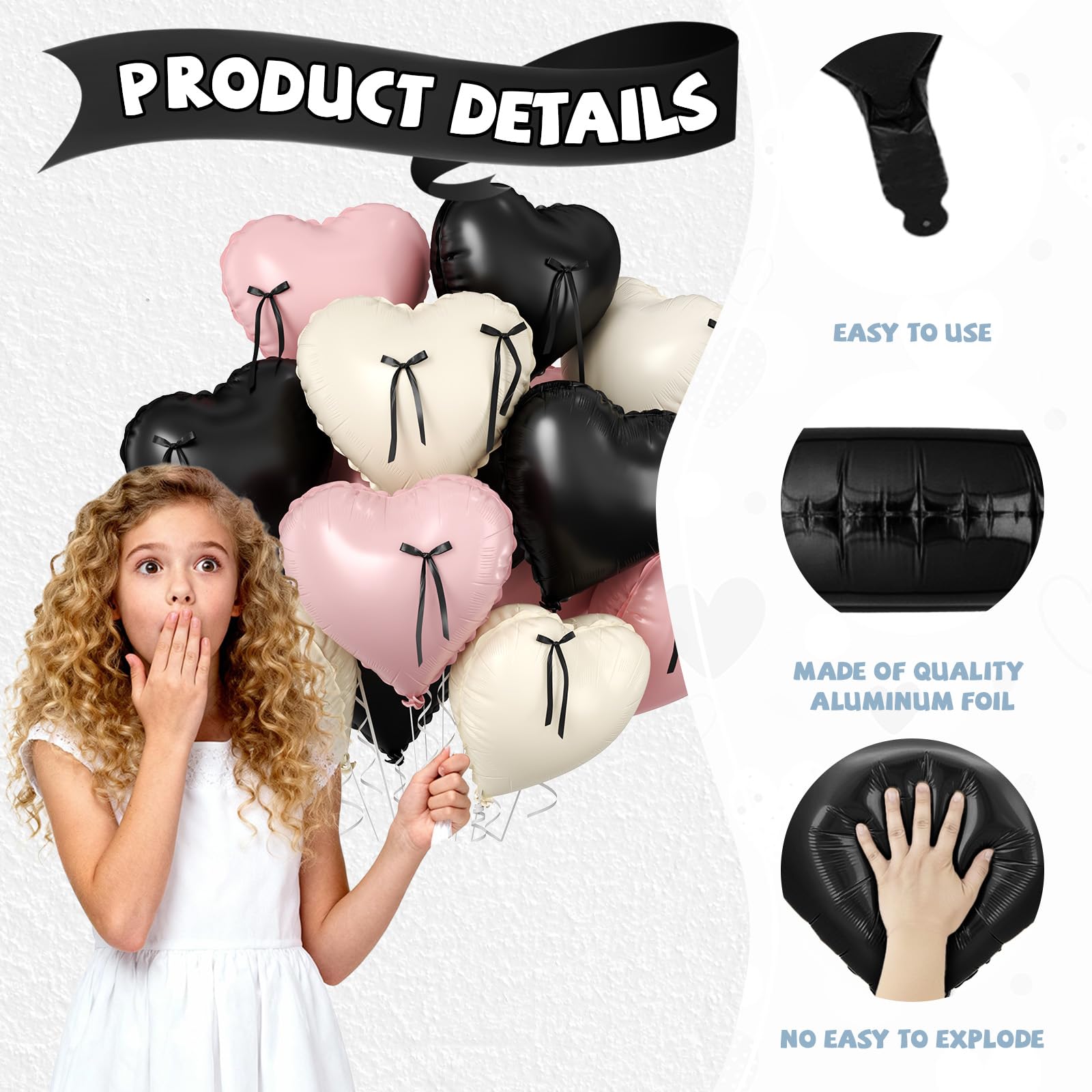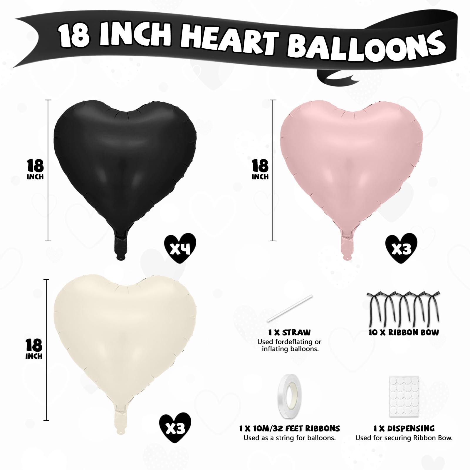10 Pcs Pink and Black Heart Balloons: Our package includes 4 x 18 inch baby pink matte heart foil balloons, 3 x 18 inch black metallic matte heart foil balloons, 3 x 18 inch cream white matte heart foil balloons, 10 x black bow ribbons, 1 x dispensing, 1 x straw for easy inflation, and 1 x white ribbon. These stylish heart shaped balloons combine soft pink with elegant black to create a chic and romantic decoration.