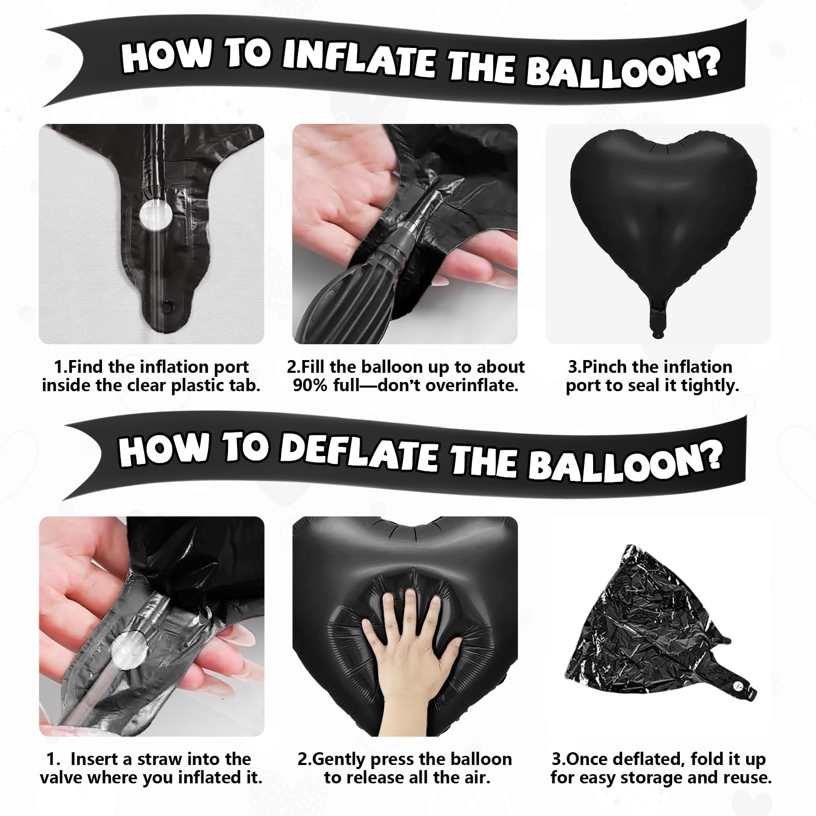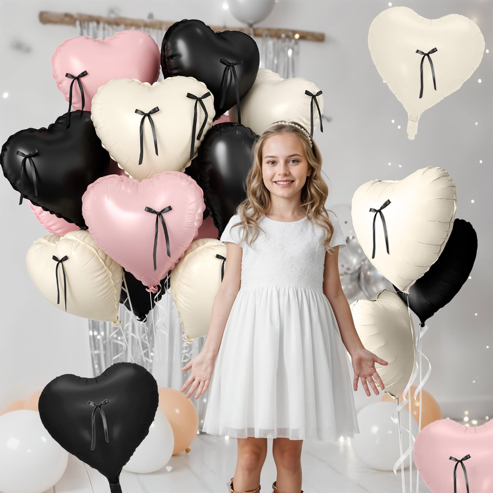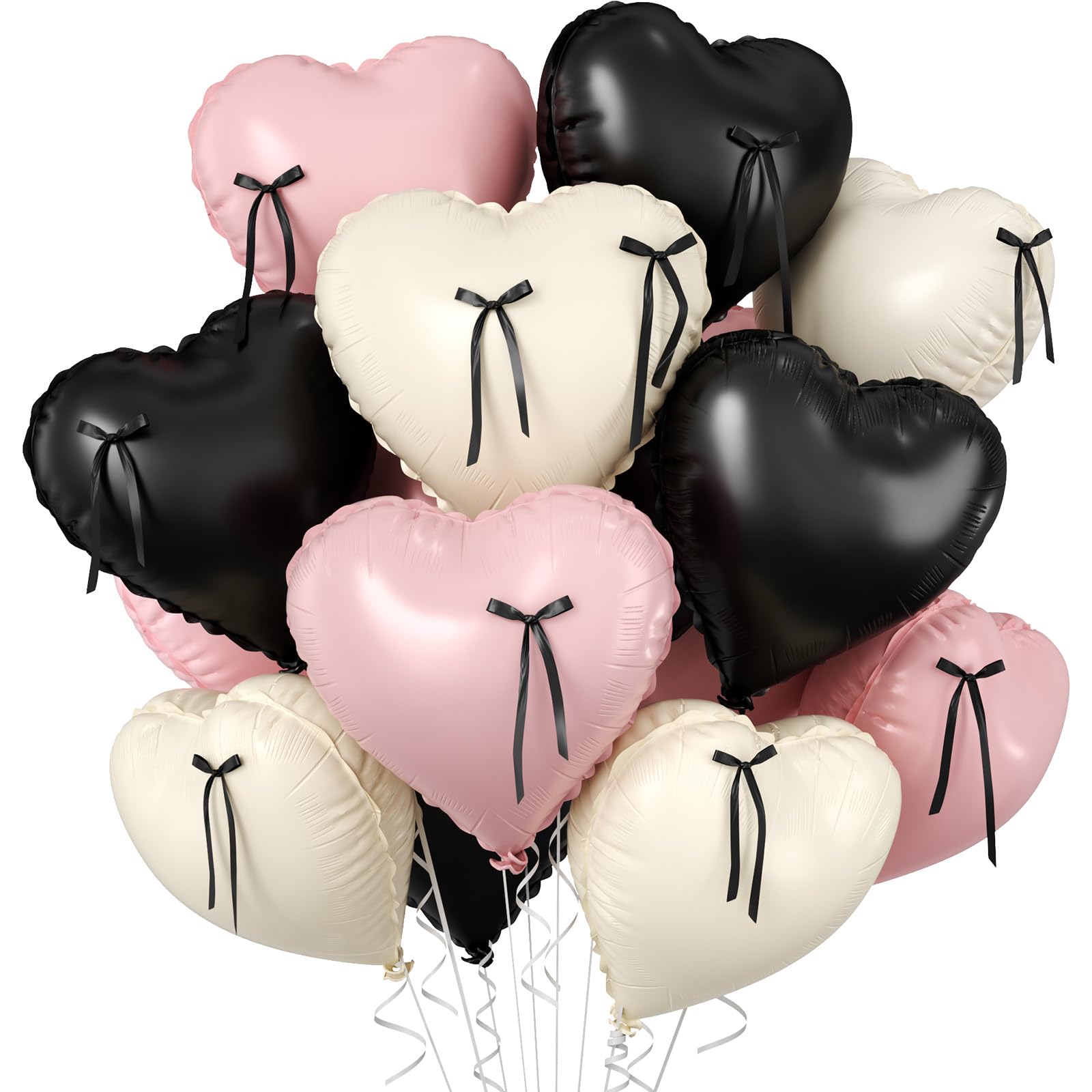 10 Pcs Pink and Black Heart Balloons: Our package includes 4 x 18 inch baby pink matte heart foil balloons, 3 x 18 inch black metallic matte heart foil balloons, 3 x 18 inch cream white matte heart foil balloons, 10 x black bow ribbons, 1 x dispensing, 1 x straw for easy inflation, and 1 x white ribbon. These stylish heart shaped balloons combine soft pink with elegant black to create a chic and romantic decoration.