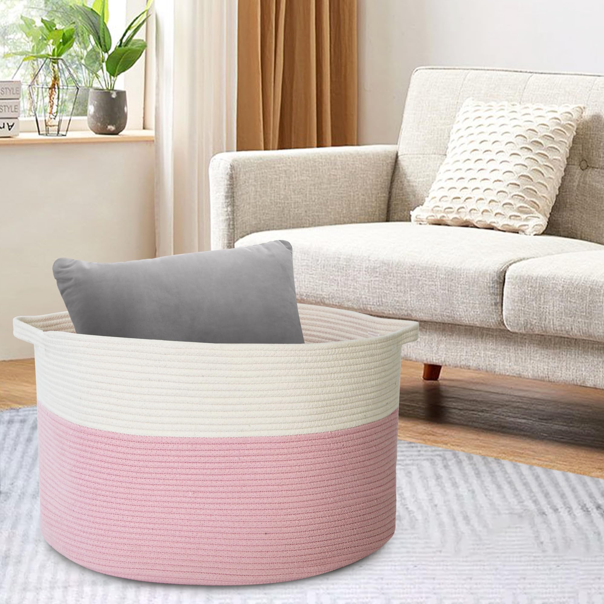 Cotton Rope Living Room Storage: The pink basket is made of natural cotton rope. Sturdy cotton rope storage baskets can withstand weight and regular use without wear and tear. Rope material is soft and safe for baby. The large opened rope basket for storage has no chemical odor and sharp edges, so it will not harm the floor and the kids.