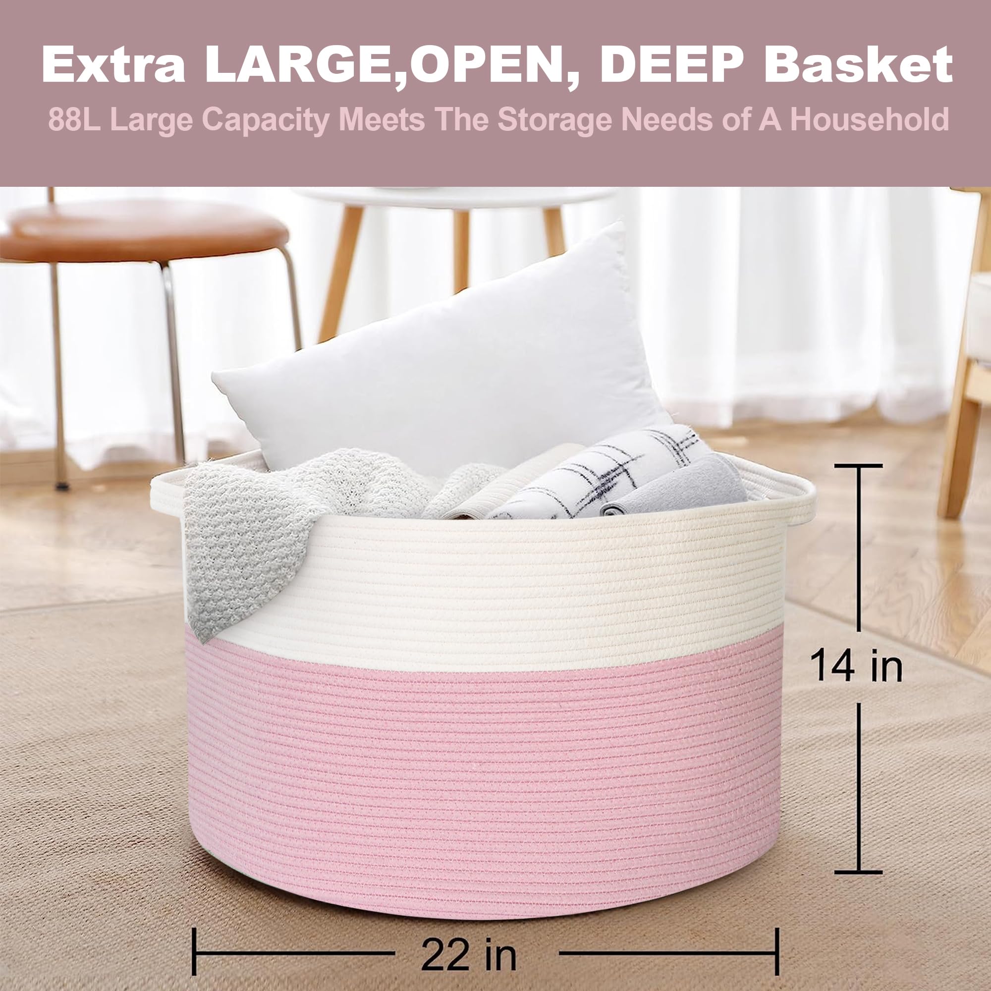 88L Large Capacity Baskets for Blanket: Extra large pink basket has dimensions of 22 x 14 inches and a storage capacity of 88 Liters. XXXL wicker pink blanket storage is huge and deep enough to store multiple blankets. Perfect for storing extra throw blankets and pillows within reach of the sofa in the living room.
