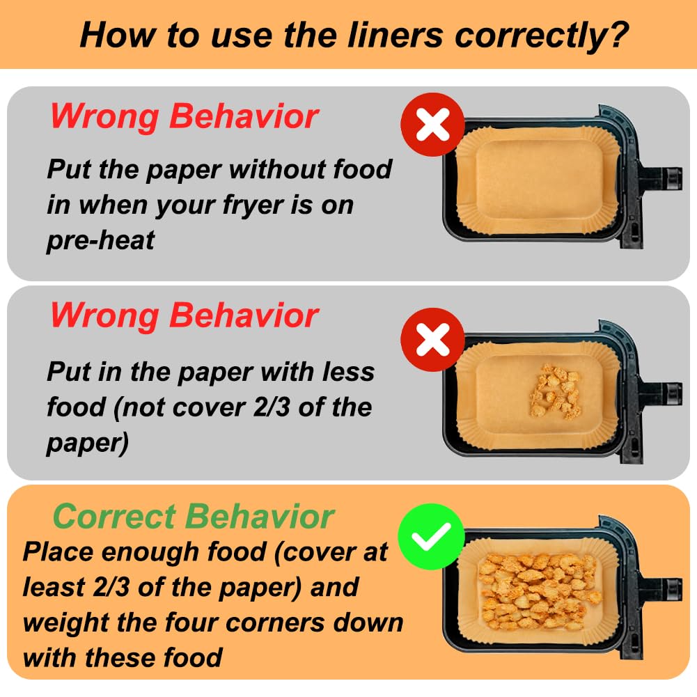 PREMIUM FOOD GRADE MATERIAL: Made from 100% food-grade pulp with a food-grade nonstick coating, unbleached, nonstick, grease-proof, waterproof, and non-absorbent, these air fryer parchment paper liners are 100% safe for daily use