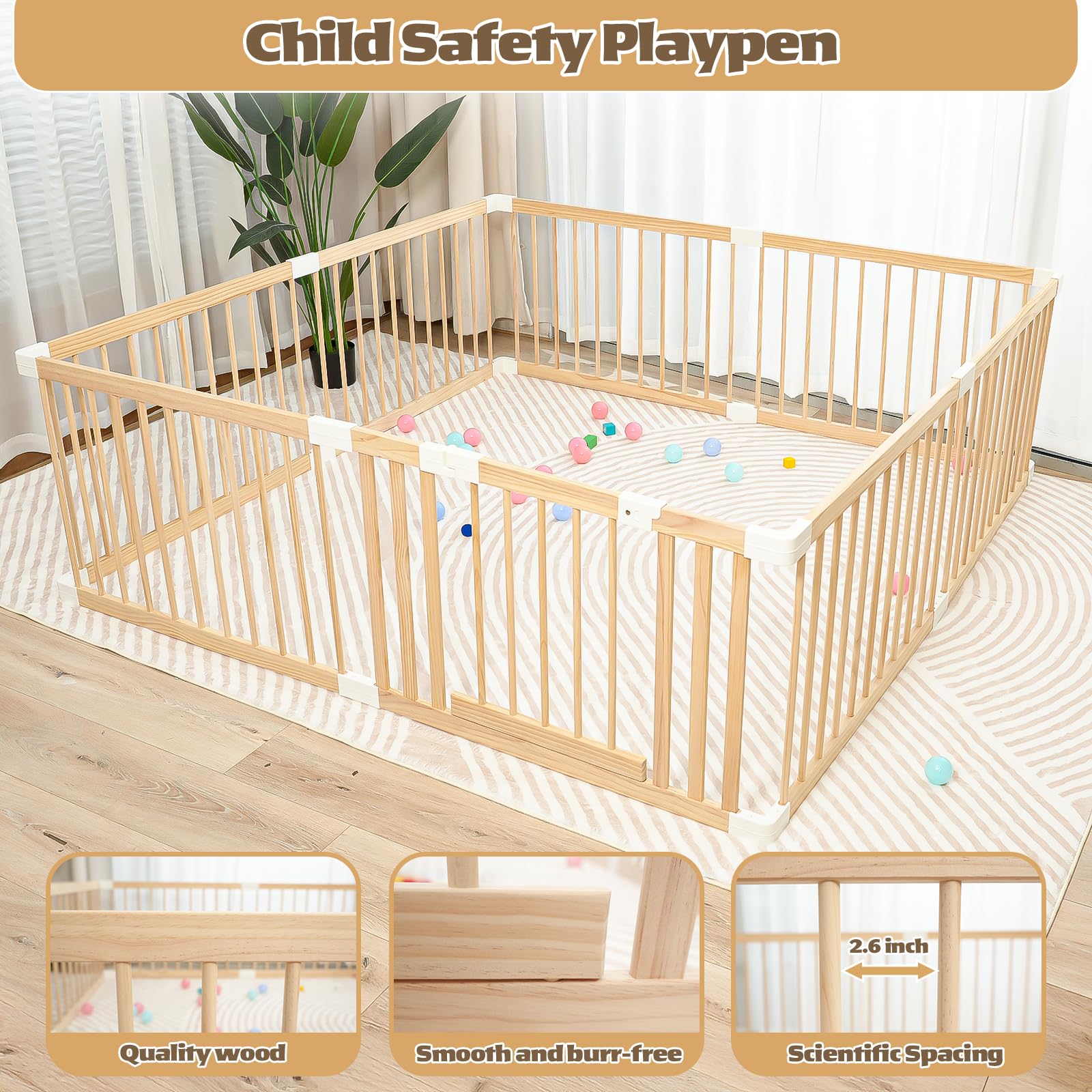 Easy to store:wooden playpen tool-free connectors design, 5-minute assembly, portable playpen for babieseasy to remove the connectors when disassembling, the fence can be stored in any corner.