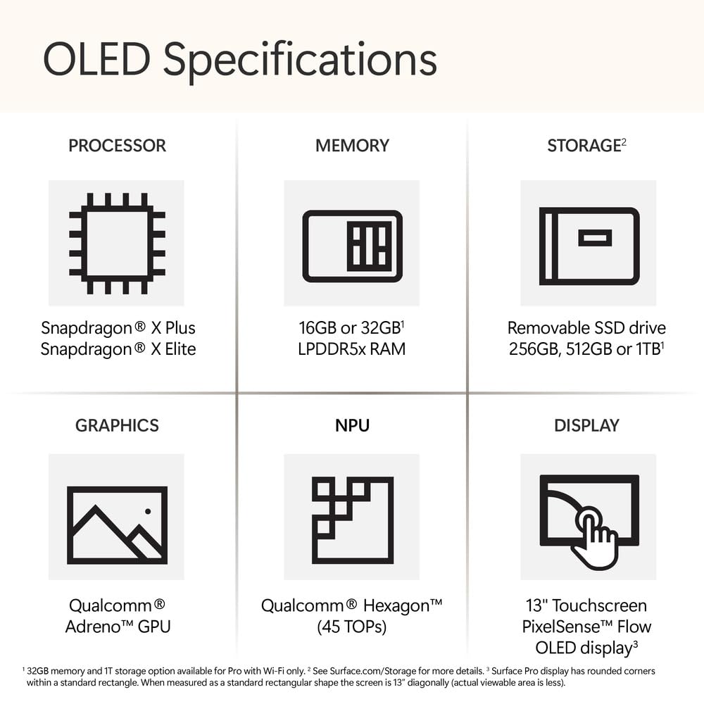* Some Copilot+ PCs require download of free updates to run Copilot+ PC experiences, available starting late 2024 – 2025. See https://aka.ms/copilotpluspcs ** Pre-release screen shown; subject to change. *** Availability of Copilot+ PC features varies by device and market. [1] Based on Cinebench 2024 Multi-threaded conducted by Microsoft in April 2024 comparing pre-release build of Surface Torrance with Snapdragon X Elite running pre-release Windows 11 26100 and Apple MacBook Air 13" with M3 running macOS 14 Sonoma. [2] Optimized for select languages (English, Chinese (simplified), French, German, Japanese, and Spanish. Content-based and storage limitations apply. See https://aka.ms/copilotpluspcs [3] 6GHz band not available in all regions. [4] Options with 5G coming later in 2024. 5G not available in all areas; compatibility and performance depends on carrier network, plan and other factors. See carrier for details and pricing. [5] Battery life varies significantly based on usage, network and feature configuration, signal strength, settings, and other factors. See https://aka.ms/SurfaceBatteryPerformance for details. [6] Available colors may vary by market. [7] Currently supports translation for video and audio subtitles into English from 40+ languages. See https://aka.ms/copilotpluspcs [8] HDR requires HDR content and enabling HDR in device settings. [9] Supporting 3 external displays requires either 2 displays connected to a compatible dock or connected through daisy chain. [10] Detached use requires Windows 11. [11] USB-C® port does not charge your Surface device or any device that requires more than 15W [12] Requires device with USB-C® USB4®/Thunderbolt™ 4 port and when supported by device and display.