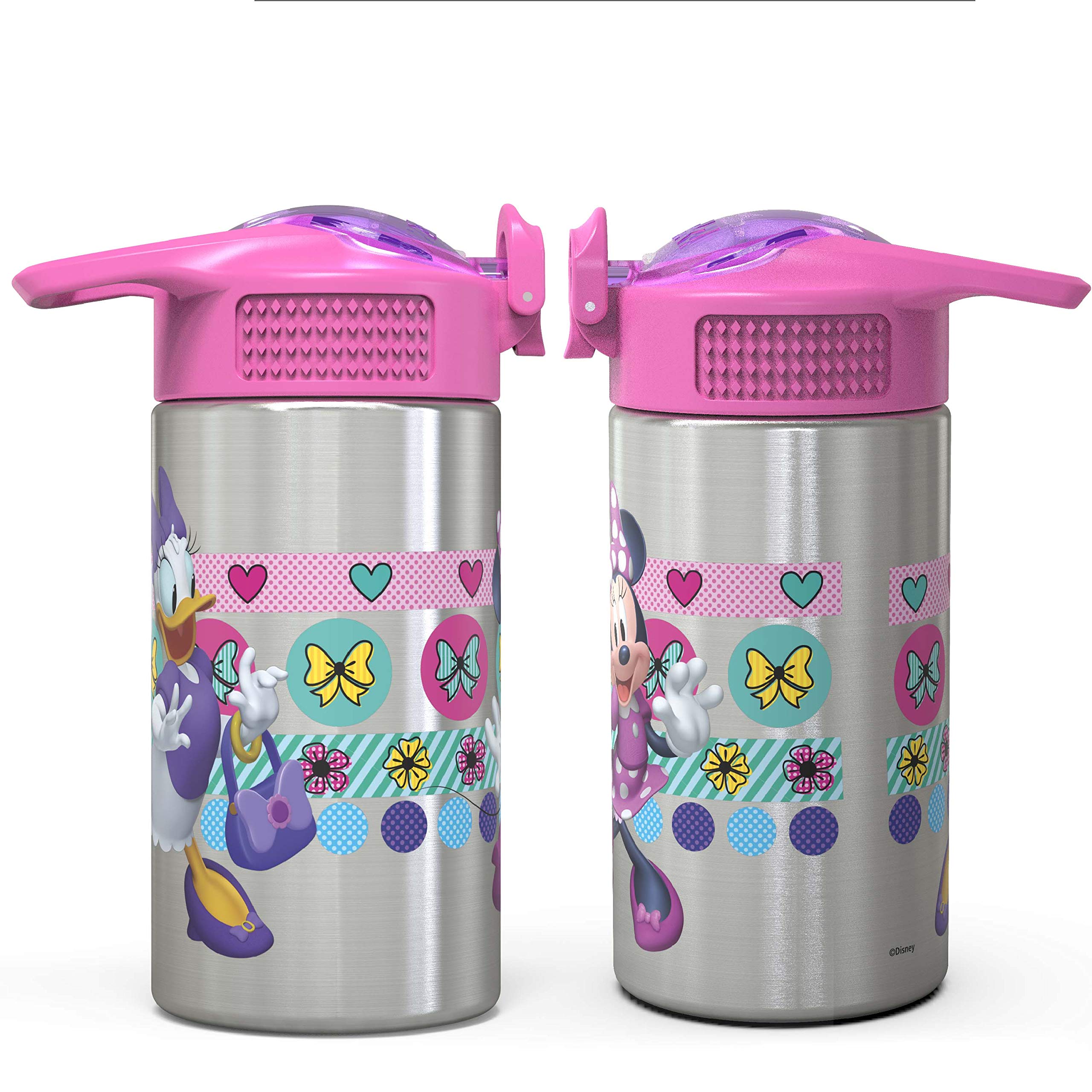 Let kids get their hands on this bottle and enjoy their water with Disney Minnie happy helpers! This reusable bottle will last wash after wash; good for you and good for the environment! Keep your family hydrated with a stainless steel water bottle by Zak designs. The 15. 5 oz. Water bottle is made of stainless steel, durable enough for kids to take anywhere they want. The one hand operation action lid has a built-in carrying loop for easy transportation, and doesn t leak when It s closed, so the bottle can be tossed into a bag for worry-free travel. The drinking straws can be removed for cleaning and the spout is tough against chewing and biting. The bottle is dishwasher safe and should not be Microwaved. Recommended for children ages 3 and up. by Zak designs, making mealtime fun!