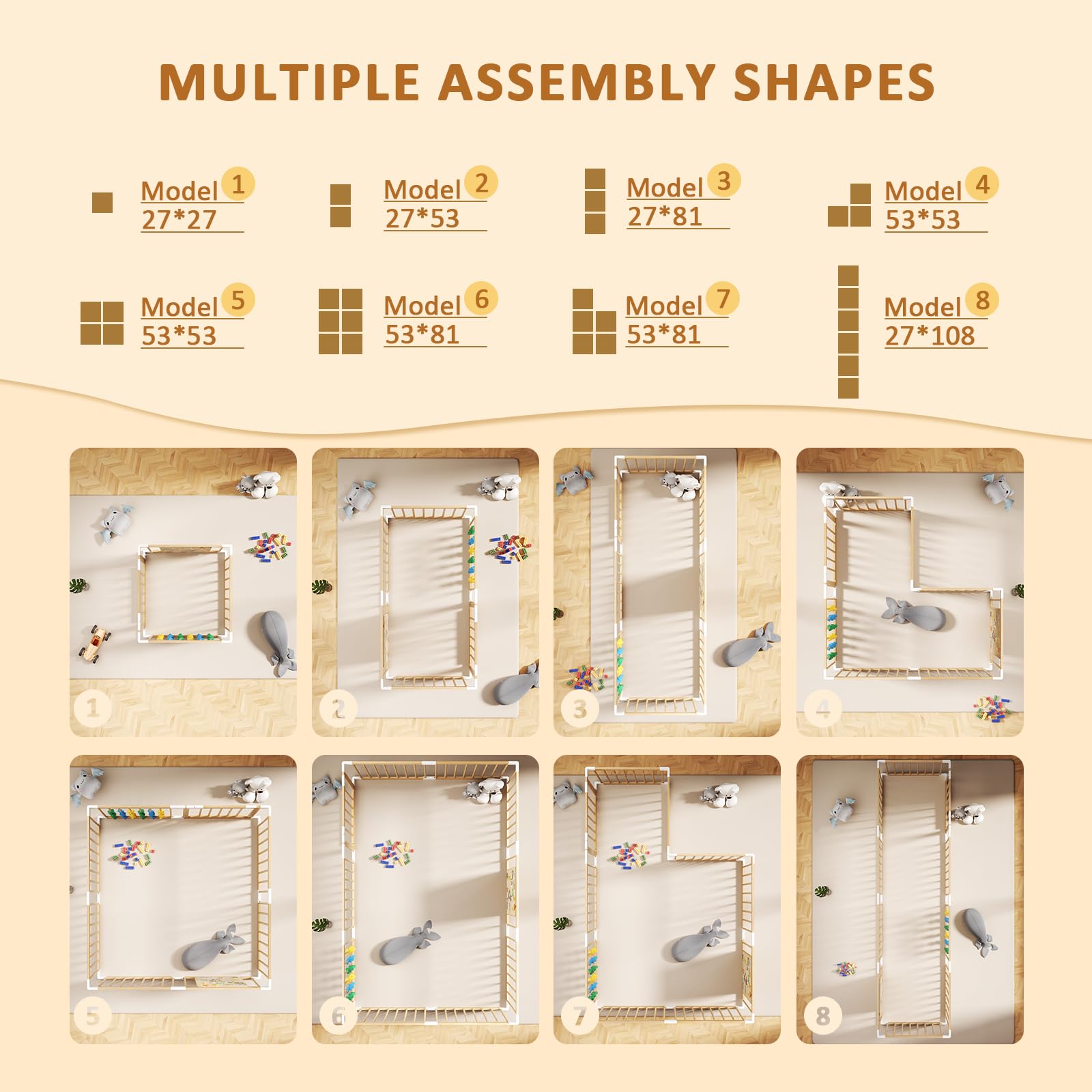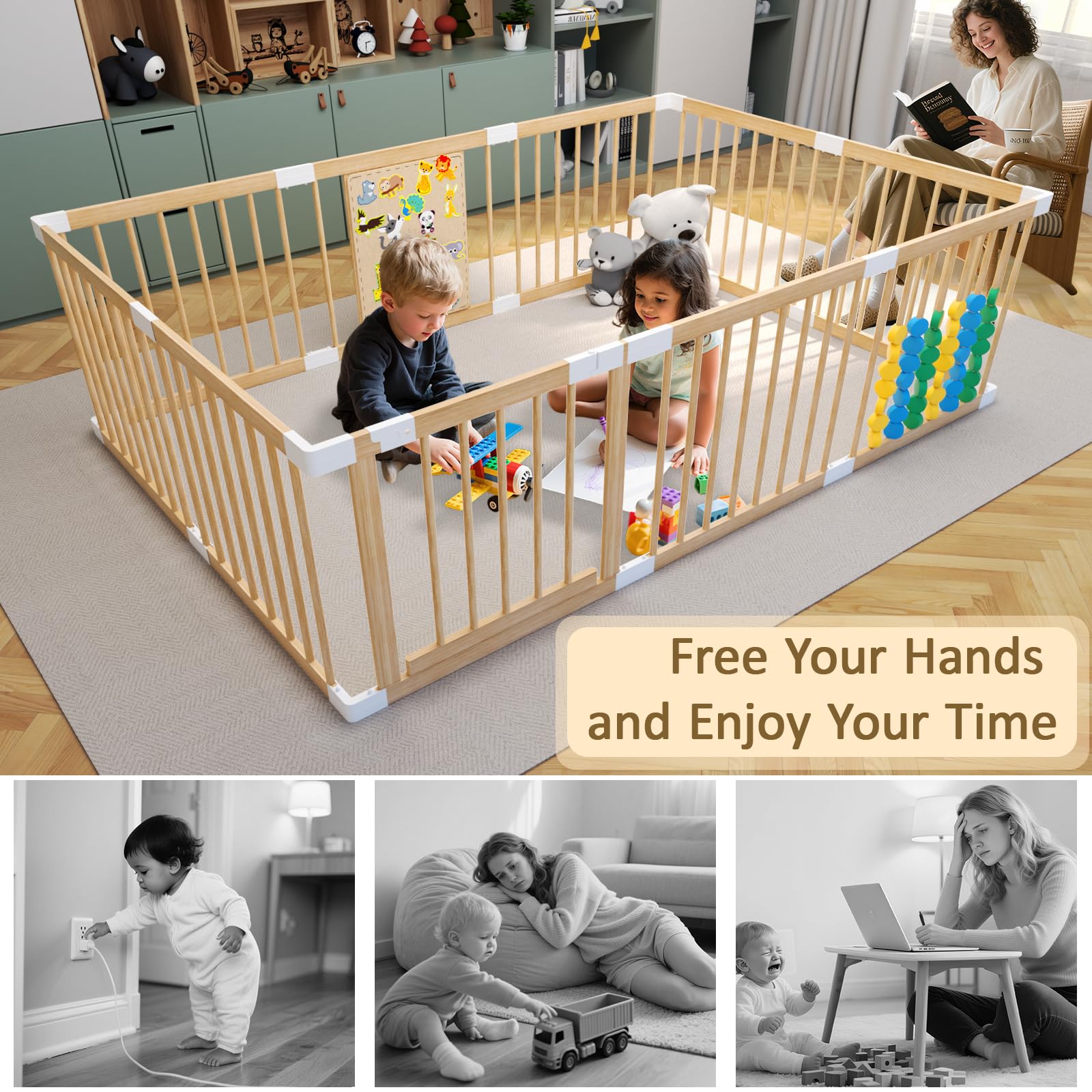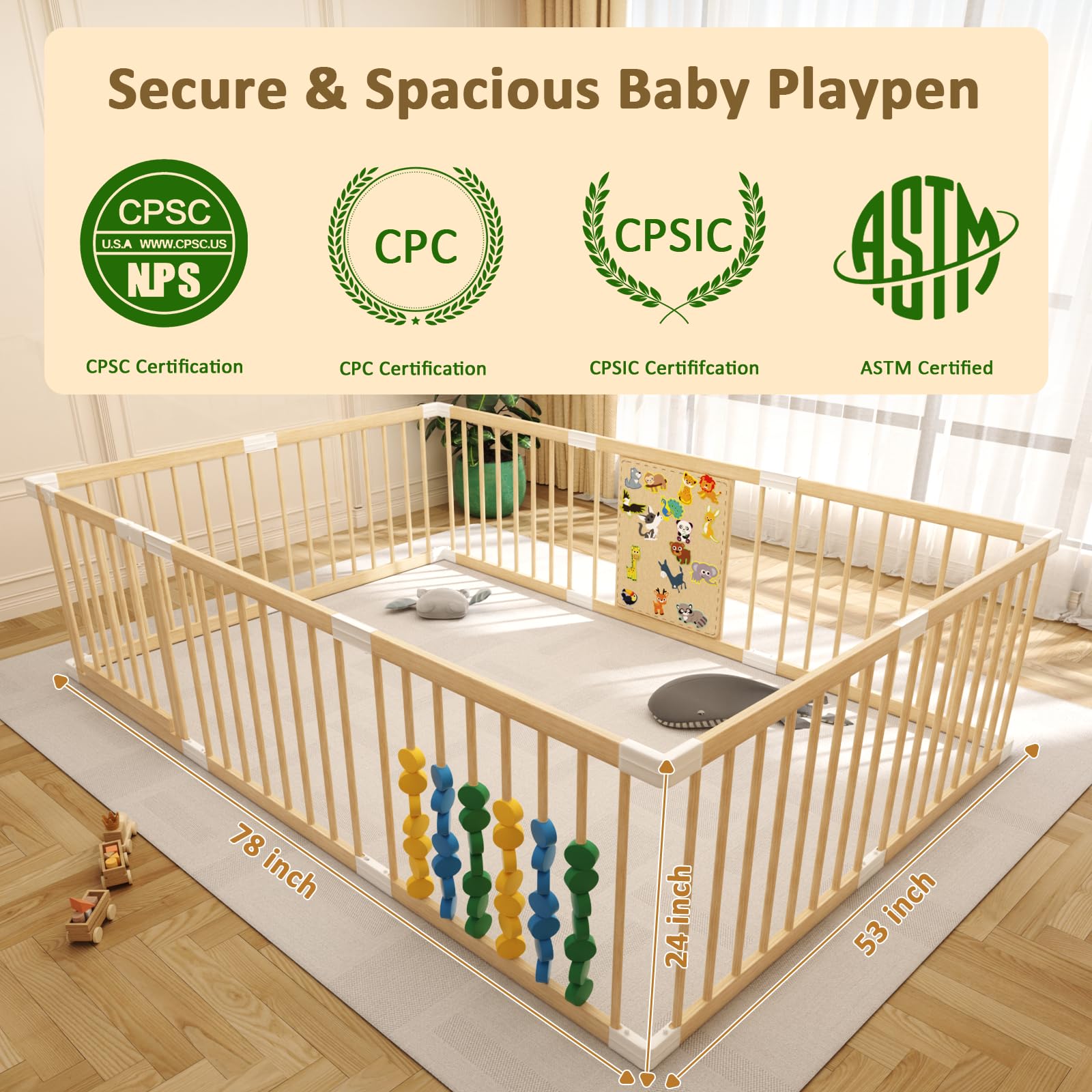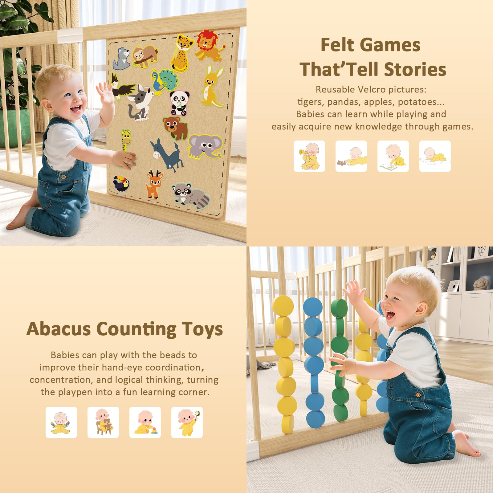 This baby playpen toy set is a must-have parenting essential that combines safety protection, dual-purpose early learning, and convenient practicality! Measuring 78x53x24 inches, it fits most home environments. The playpen is CPC certified and meets children's product safety standards. Featuring a soft felt base and reusable 3D stickers, allowing babies to identify animals, fruits, and colors while playing. Simultaneously, manipulating the abacus beads enhances hand-eye coordination, focus, and logical thinking. This transforms the playpen into an engaging learning corner, delivering Montessori and STEM dual-stimulation through play-based education. The wooden playpen features tool-free assembly, taking just 5 minutes to set up. Disassembly and storage are equally effortless, saving space. Its transparent design allows parents to monitor their baby while working or doing household chores, truly freeing their hands. It balances companionship with freedom, providing a sefe and engaging space for your little one's growth.