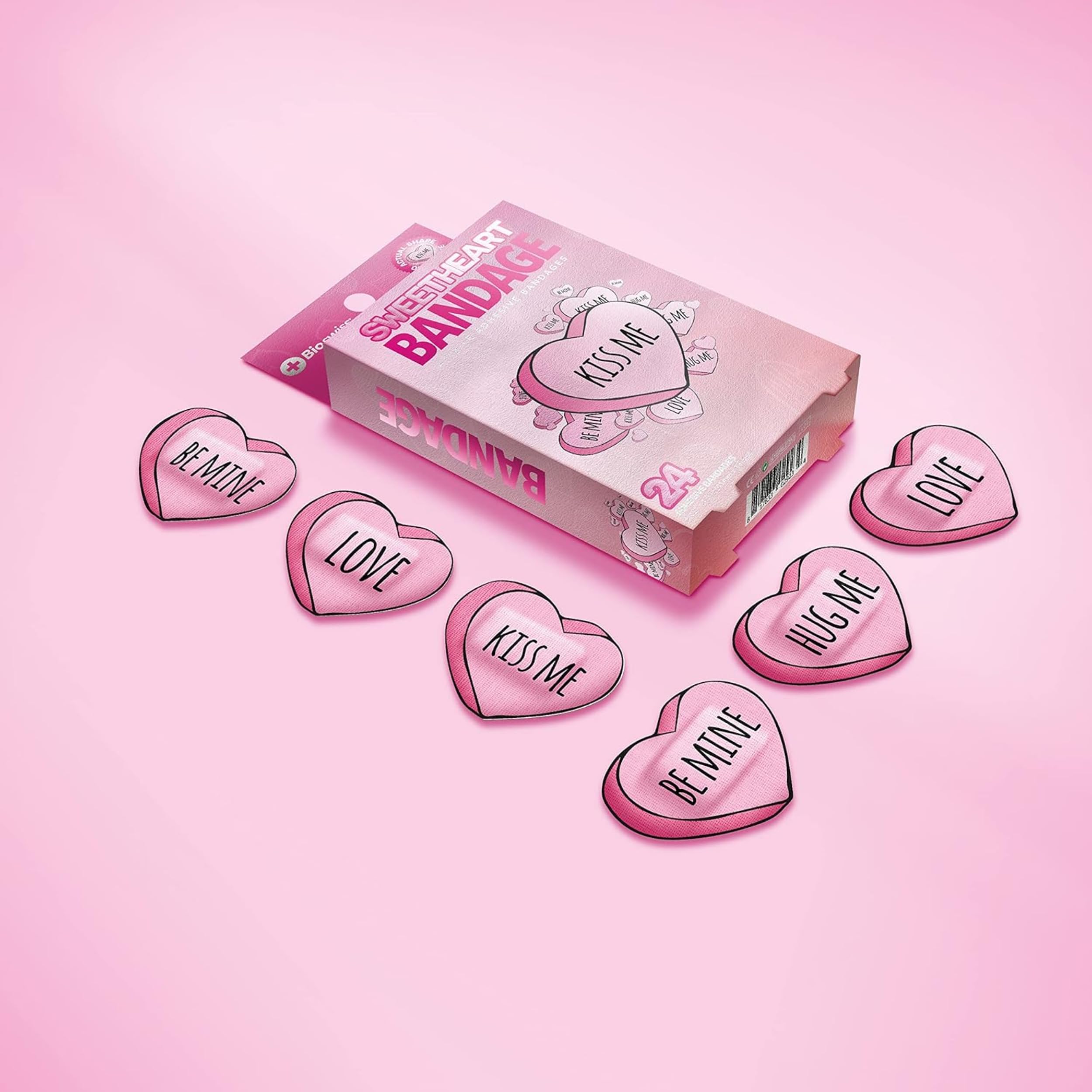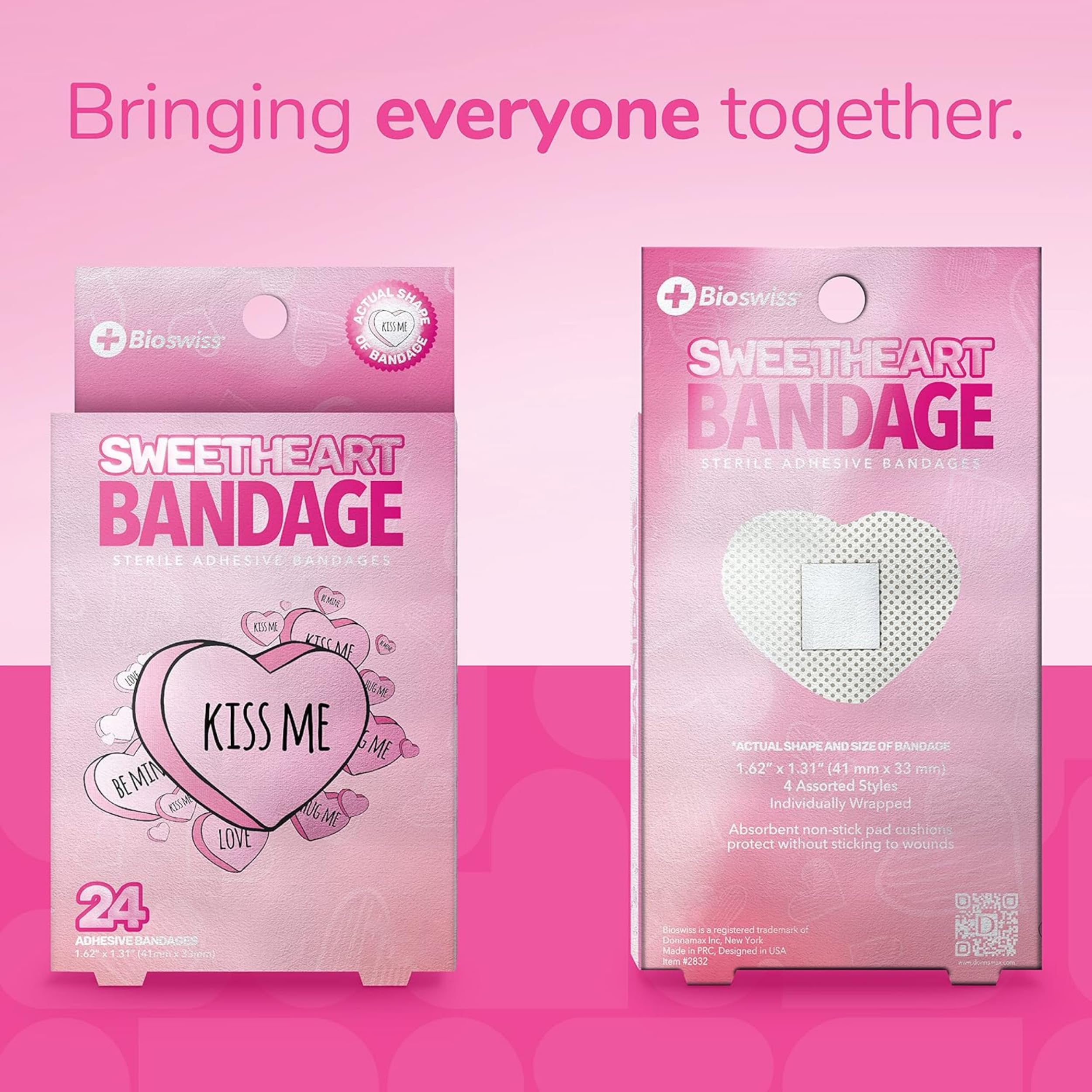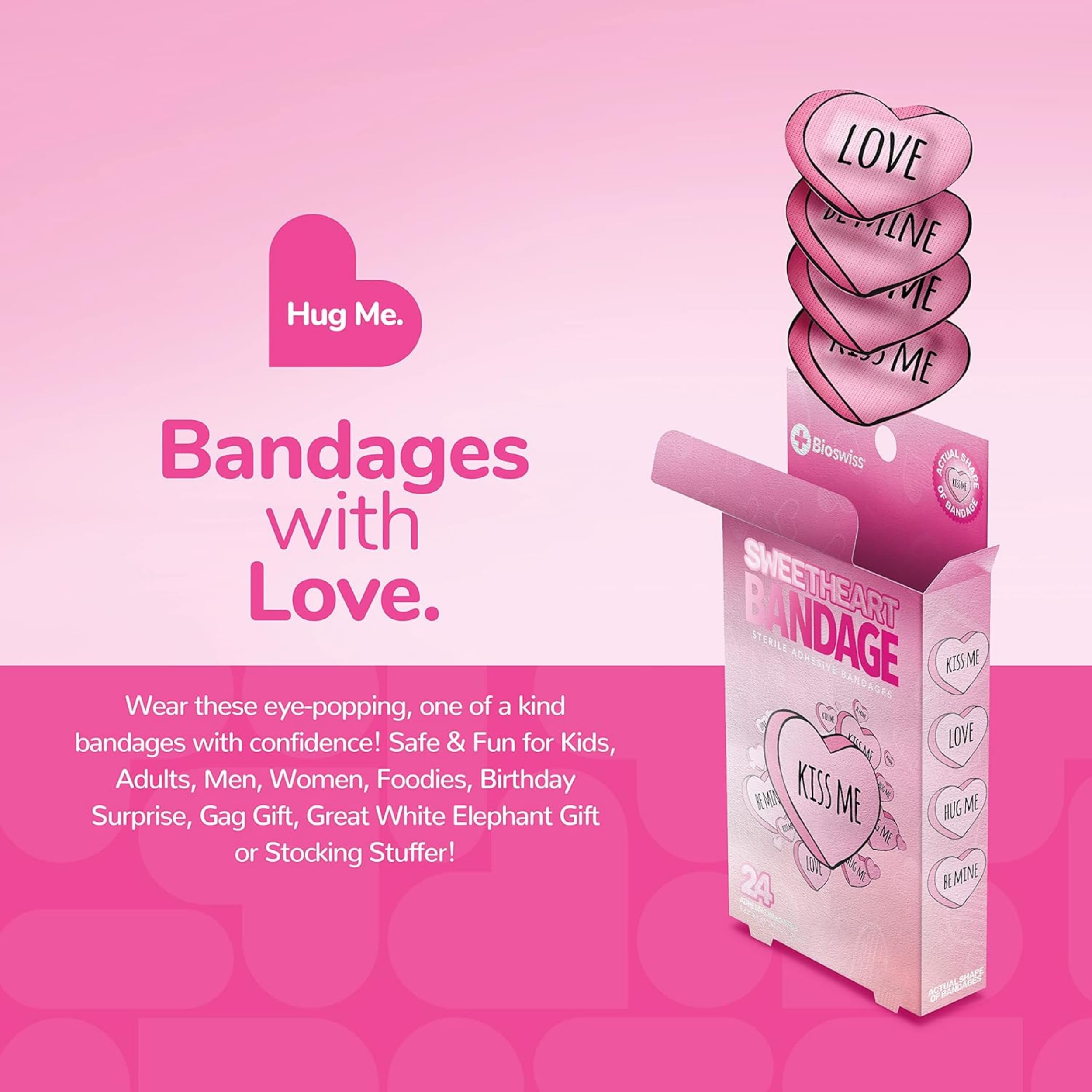 VALENTINE HEART BANDAGES: This 24 piece pack of funny Valentine heart "Kiss Me" bandages is great for putting a smile on kids' faces while protecting wounds such as cuts, scrapes, and burns, and come in 4 assorted styles; sticky bandages are perfect for kids and adults alike, and also for school nurses and pediatric doctors
