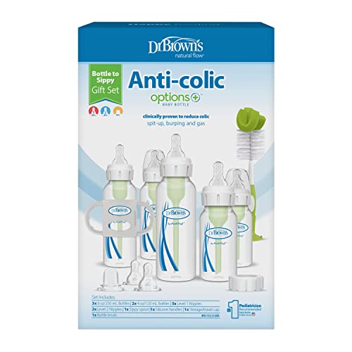 Dr. Brown's Natural Flow® Anti-Colic Options+™ Narrow Bottle to Sippy Gift Set with Soft Silicone Sippy Spout, Removable Silicone Handles, Travel Cap and Bottle Brush