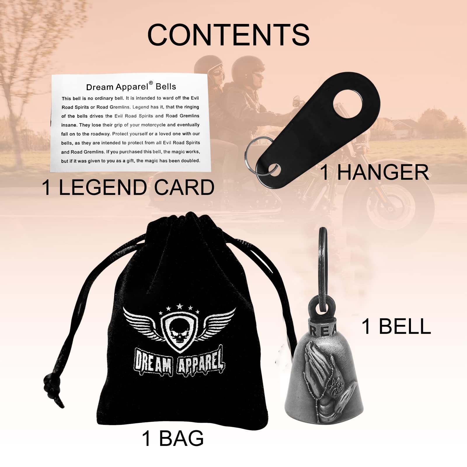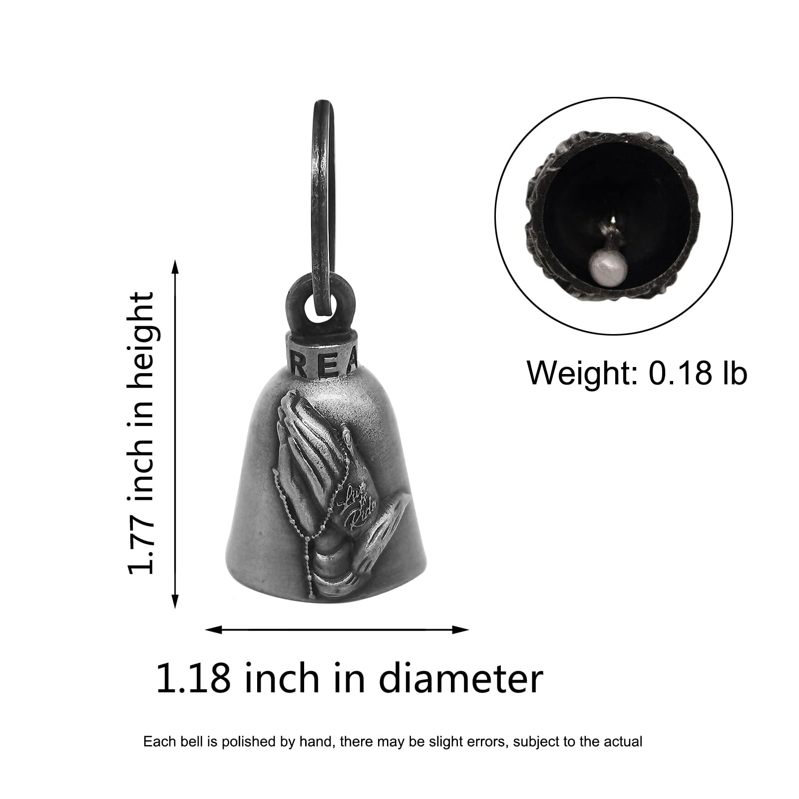 [Size] The motorcycle bell is 1.18 inch in diameter, 1.77 inch in height, and the clasp is 1.18 inch in diameter. The weight of the bell is 0.18 lb. You‘ll receive a motorcycle bell, a black hanger, a motorcycle bell legend note card, and a 2.75" x 3.62" velvet drawstring black bag. Various exquisite patterns are available according to your personal preferences.