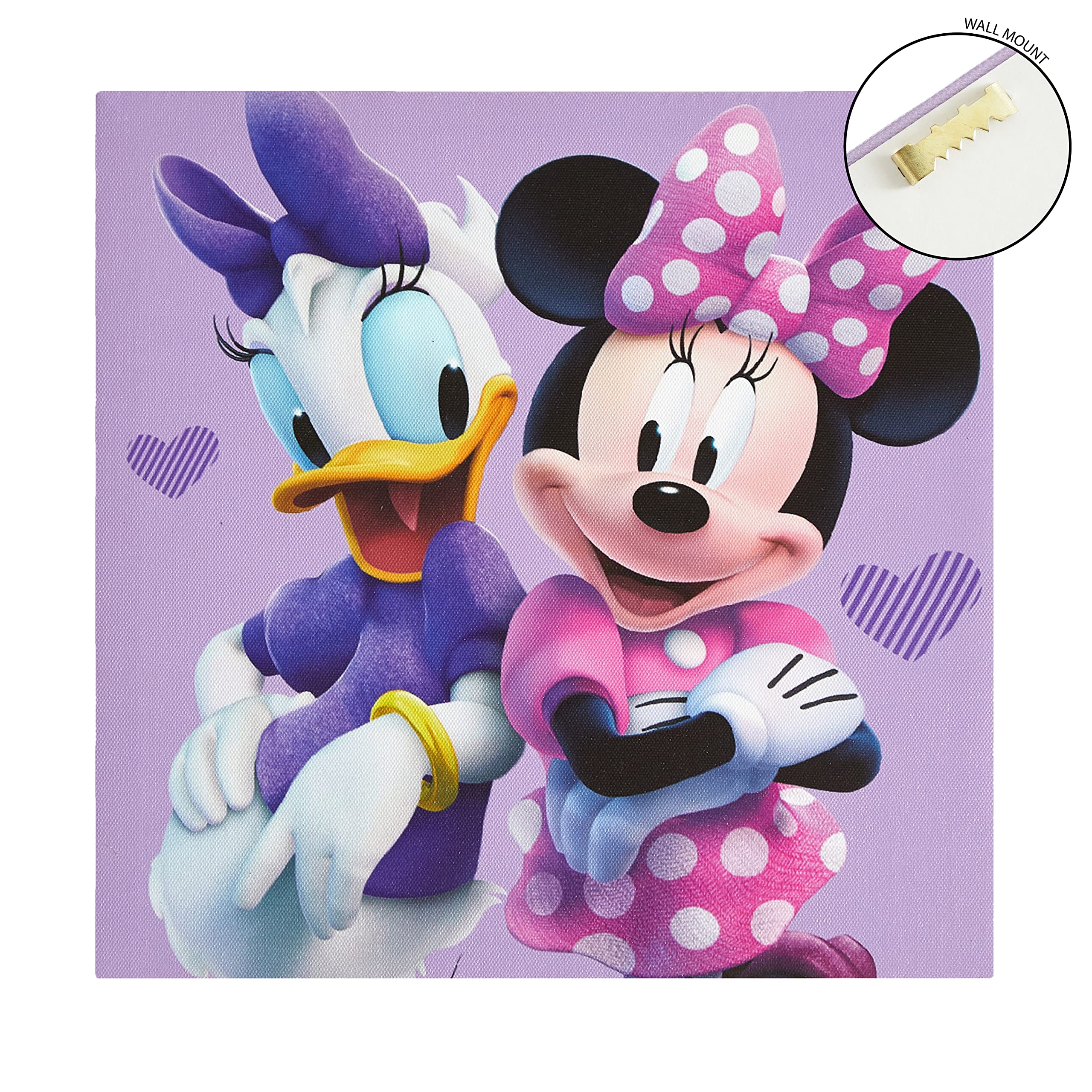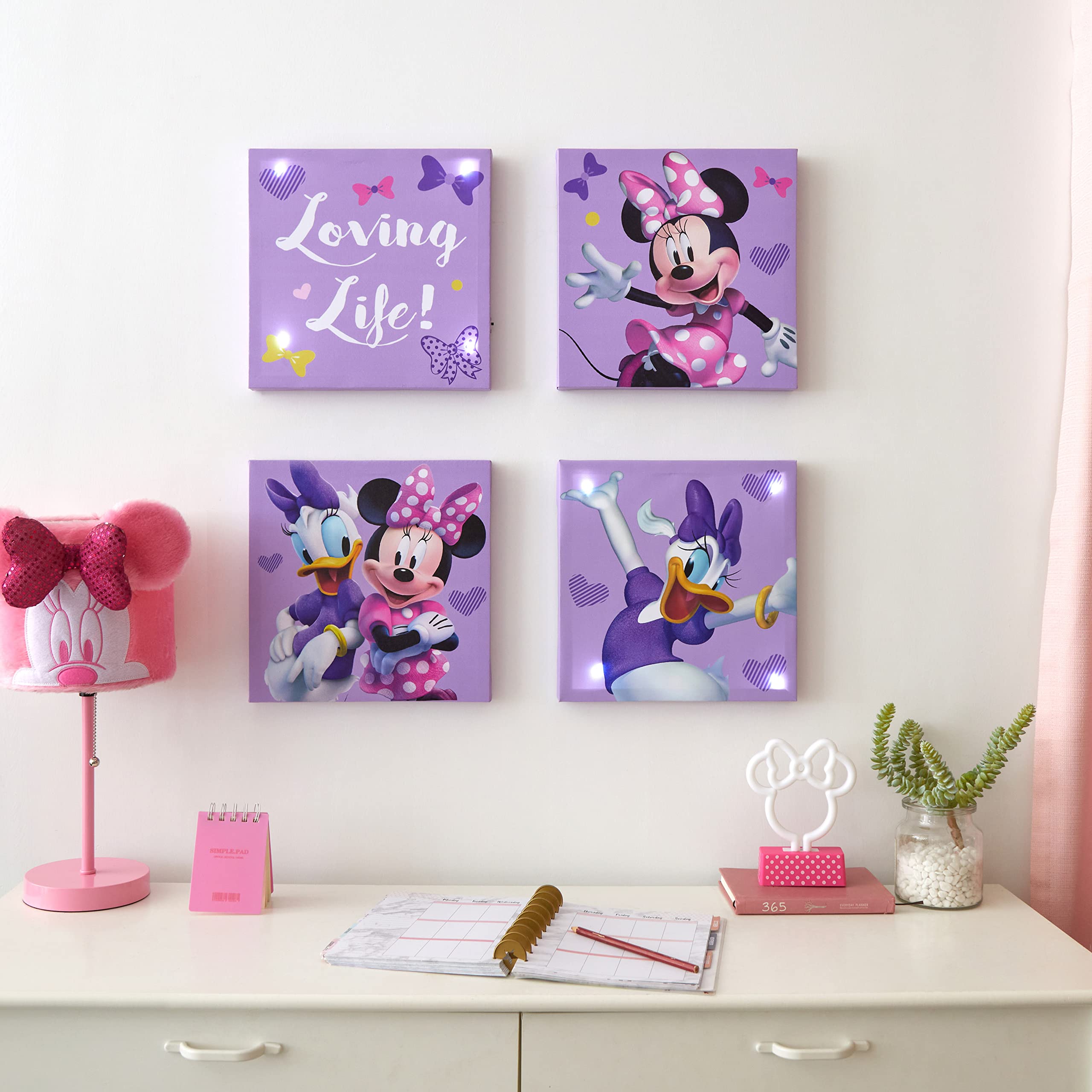 Mount the Minnie Mouse 4-Pack canvas wall art to add to the decor of any child's playroom or bedroom. Each panel features graphics from kids favorite Minnie Mouse . Set includes 4 square panels that can be part of a collection or stand alone. No assembly required and is easy to mount. Dimensions: 11. 25" L x 11. 25" W x 1. 5" H.
