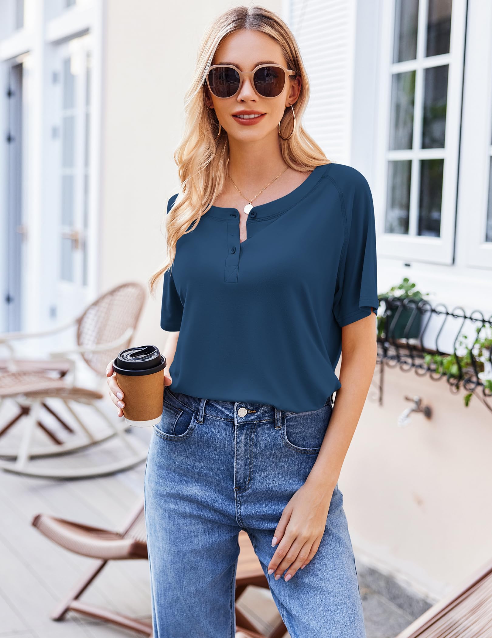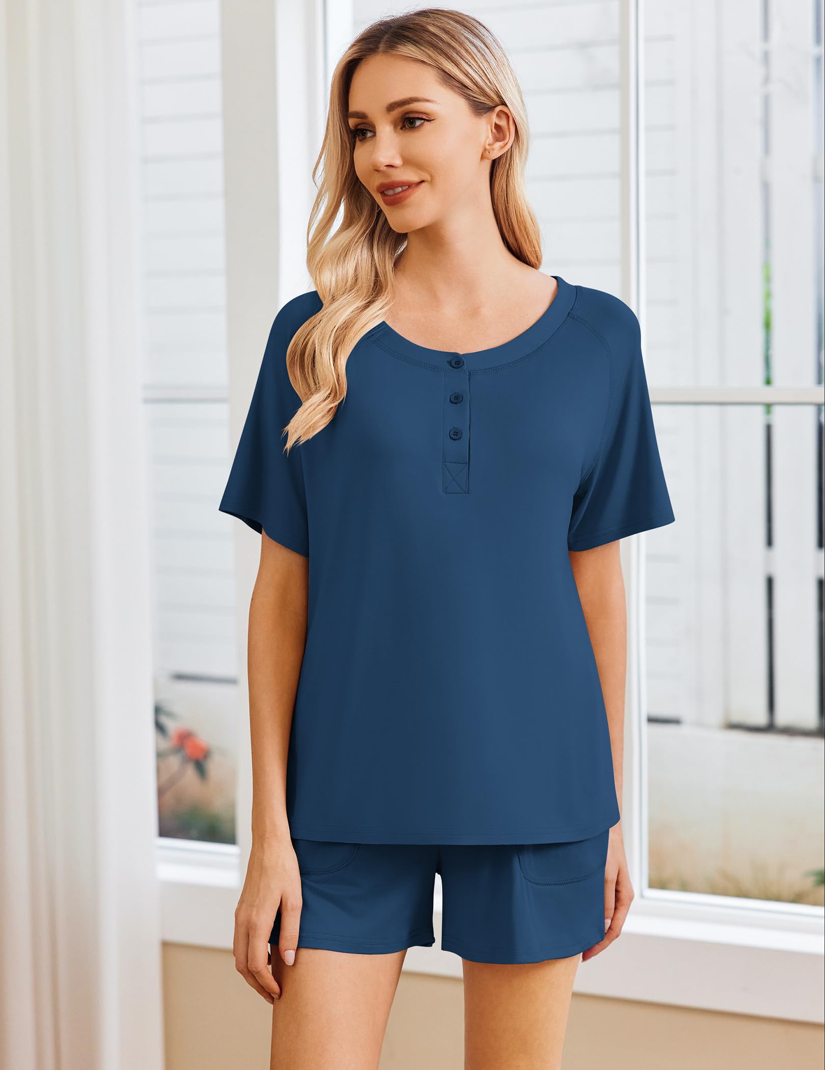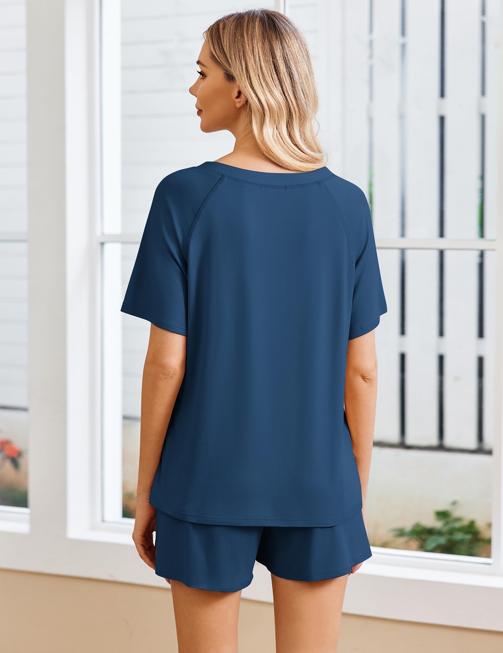 Comfortable and Relax Cut: Classic Crewneck with Buttons, short sleeve t-shirt pajamas tops, Drawstring Elastic Waist ,shorts pajamas lounge set featuring a convenient pocket
