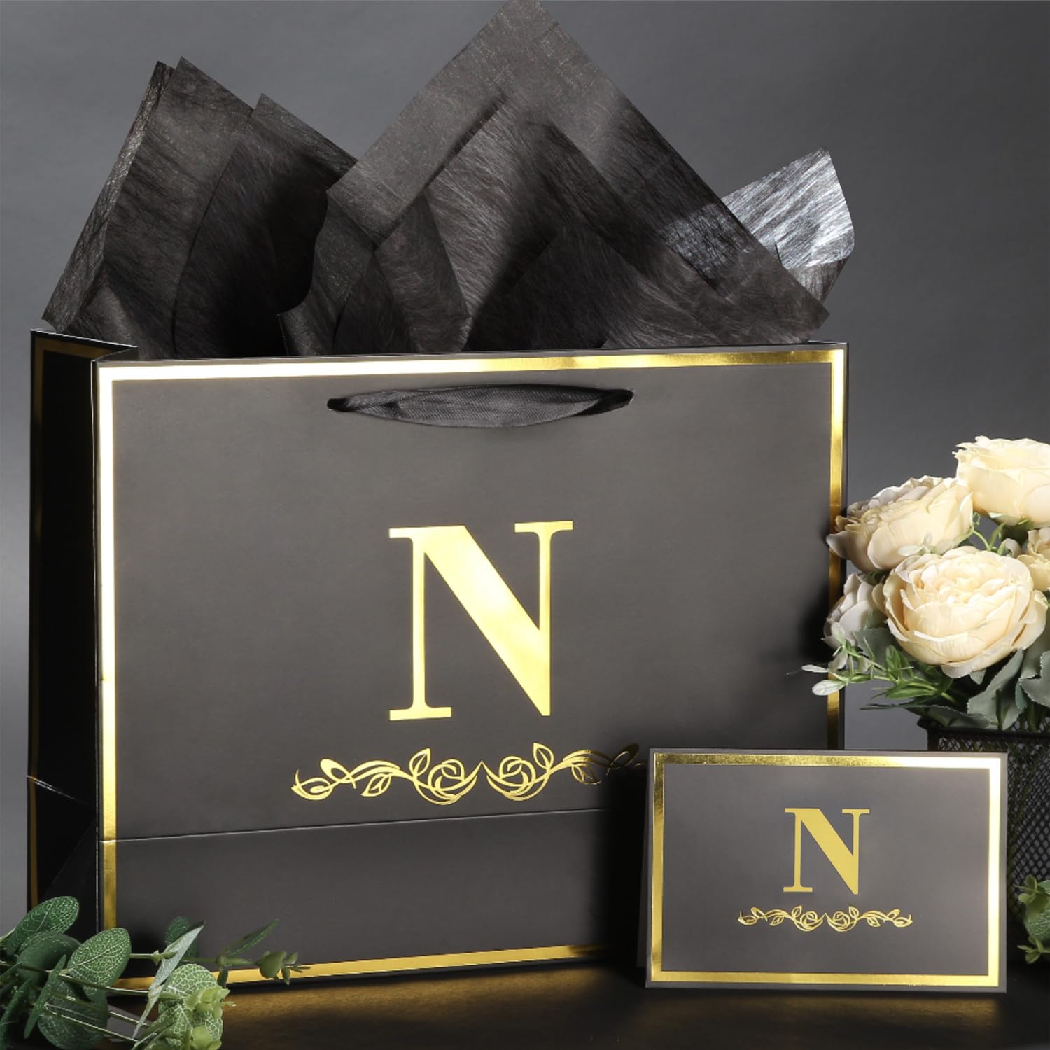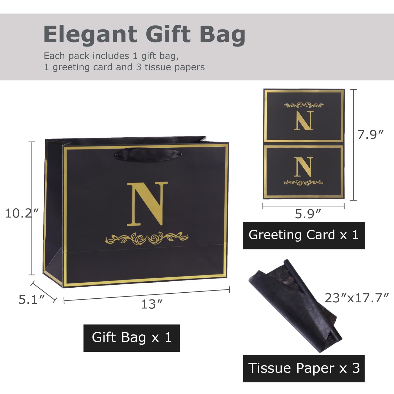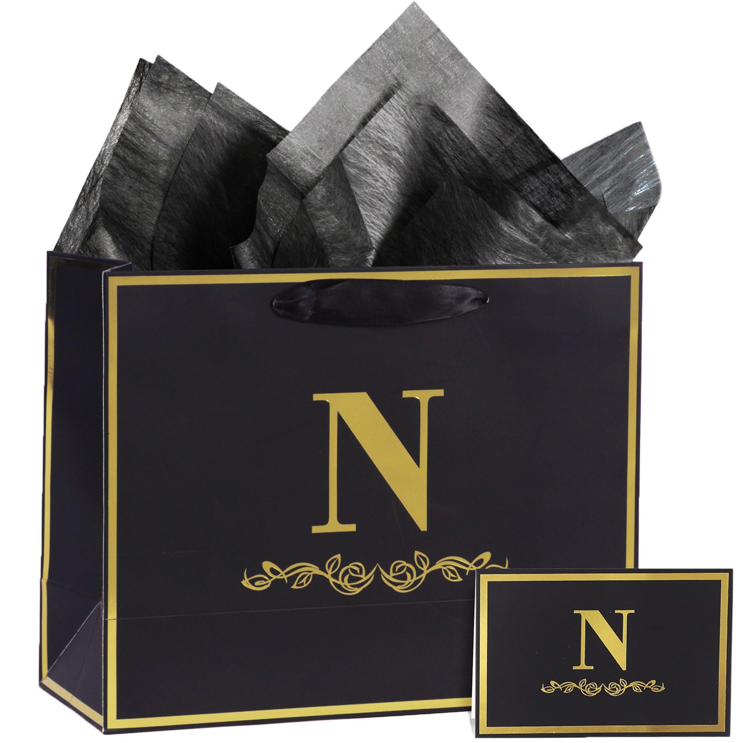 Alphabet Birthday Gift Bag with Card and Tissue Paper for Men Women, 13" Large Black Gold Personalized Horizontal Paper Bag for Gifts Wrapping - (Letter N)