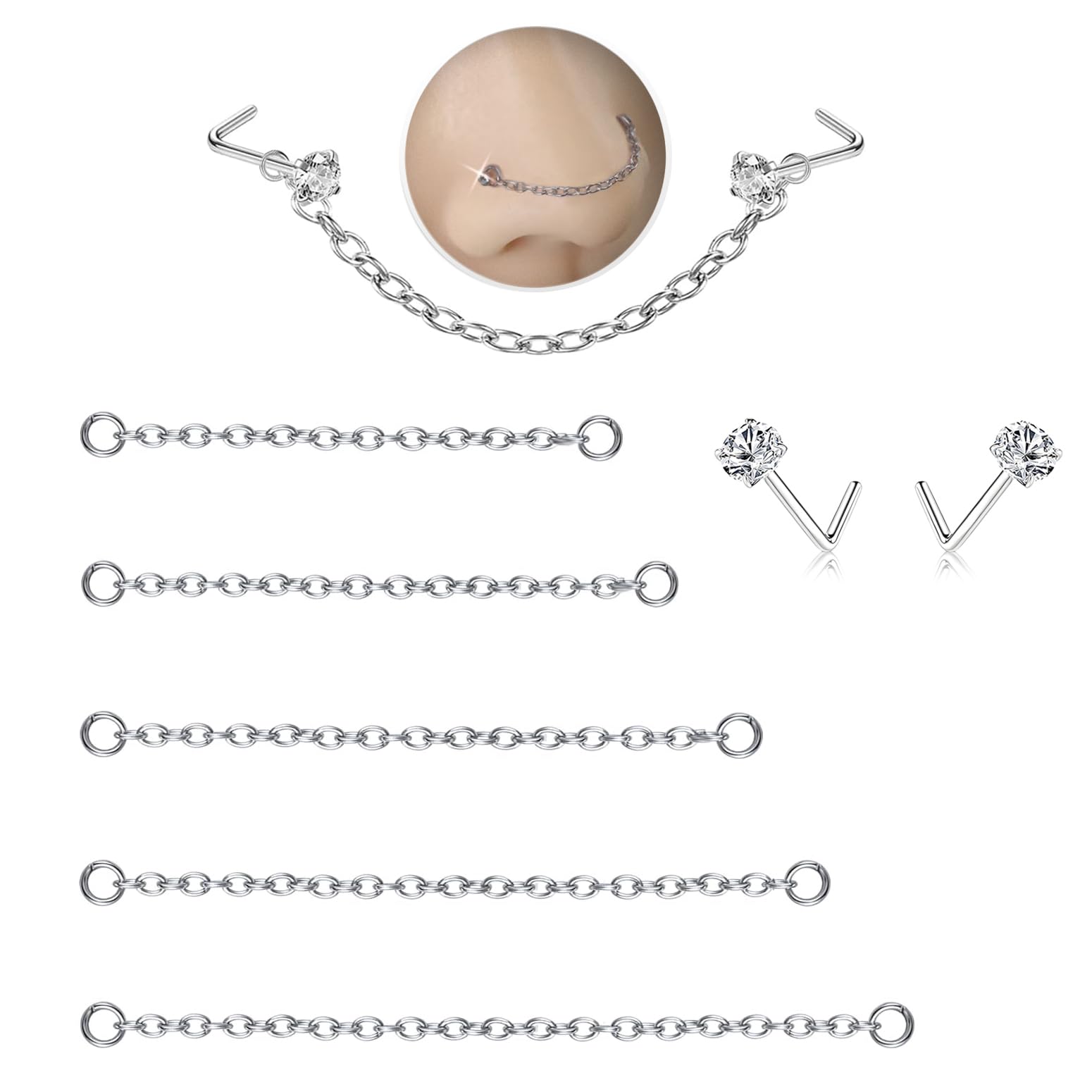 What You'll Get: 2pcs 20G L shaped nose rings studs and 5pcs different sizes of nose ring chains.This nose ring set is perfect for those with paired, double, or high nostril piercings. A great gift for both women and men who love unique nose jewelry!