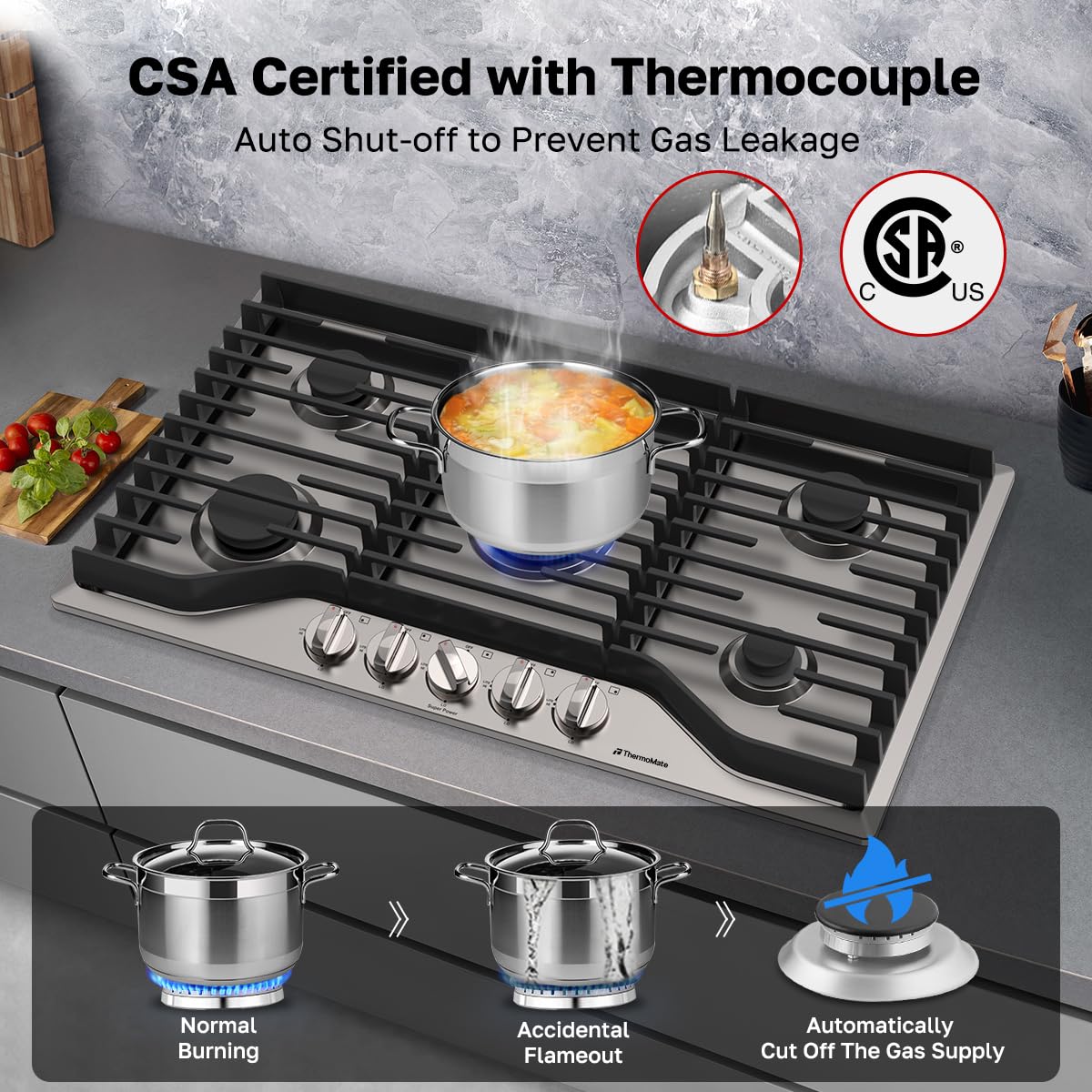 thermocouple&CSA: This 36 inch NG/LPG gas stove-top has CSA certified gas pressure regulator, equipped with a thermocouple flameout protection technology (FFD) automatically turning off gas when no flame is detected. Prevent accidental touch by children with ignition controlled by a push-type rotary switch.