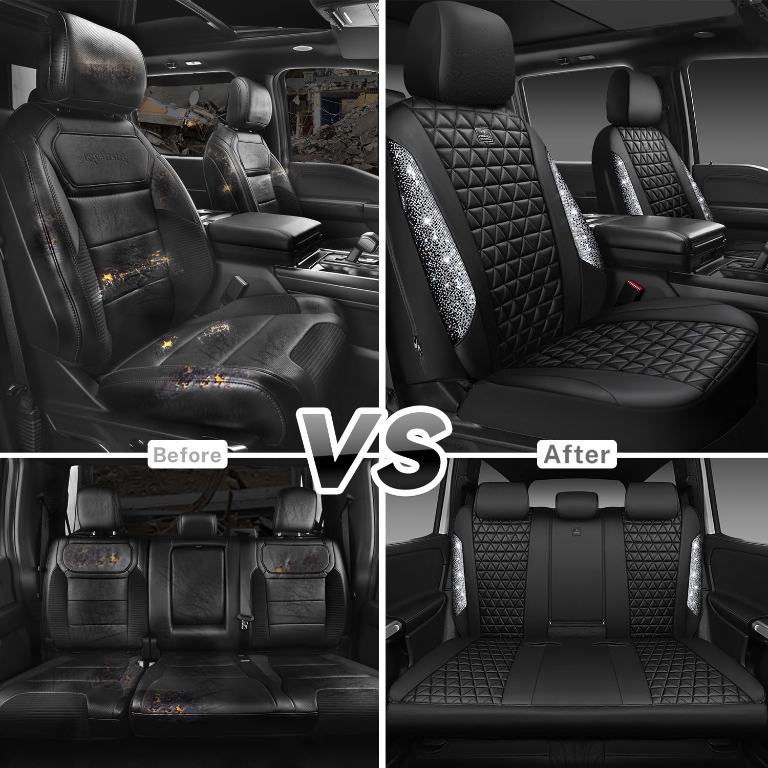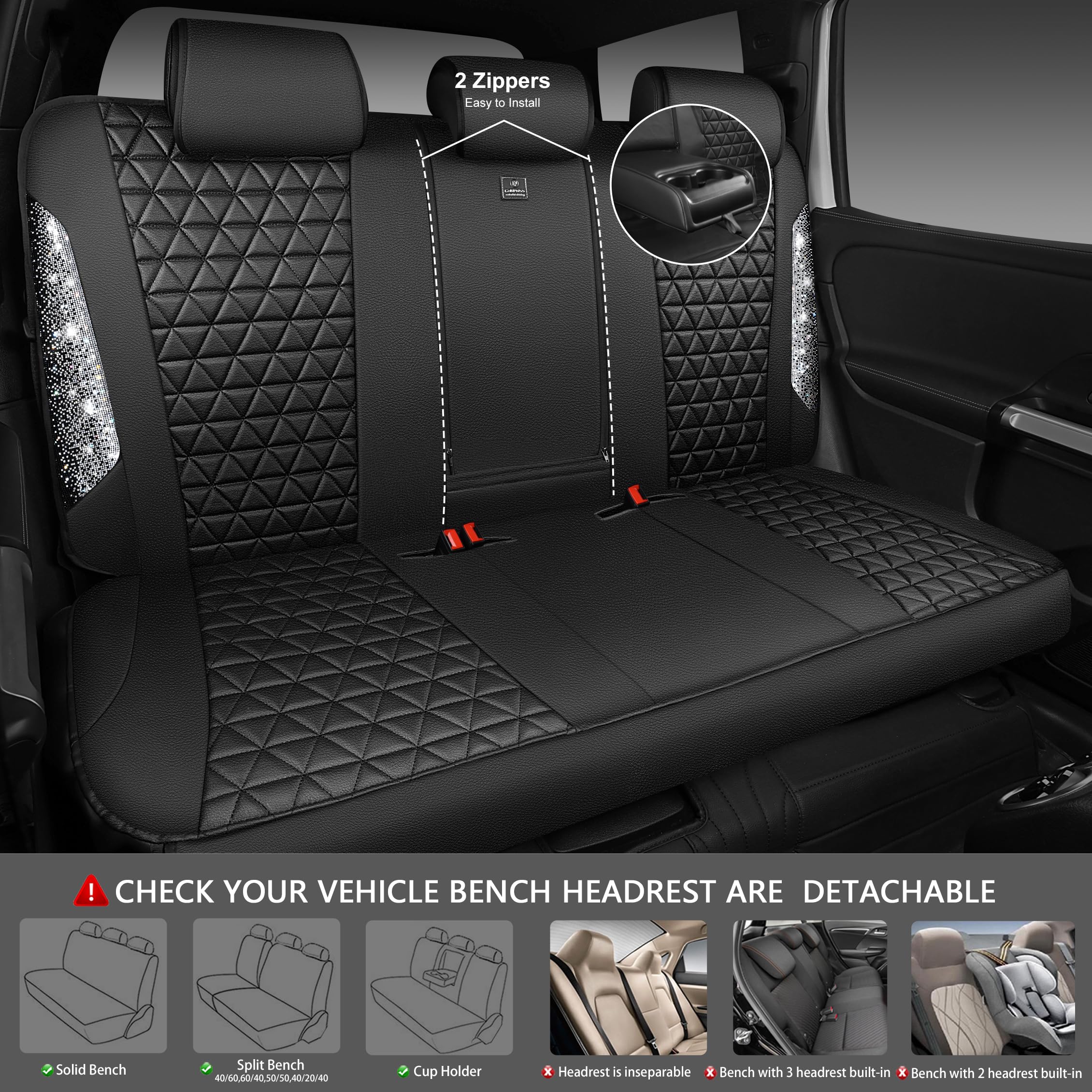 UNIVERSAL SPARKLY DIAMOND - Refresh your car if you install the bing bling crystal diamond leather seat covers, water resistant material. Surface rhombic texture design lined sponge soft and comfortable. Fit for most SUV Sedan Pickup coupe automobile vehicle seats with adjustable headrests. Can be installed with the detachable headrests. Easy to install, with installation manual, can be installed in 10 minutes