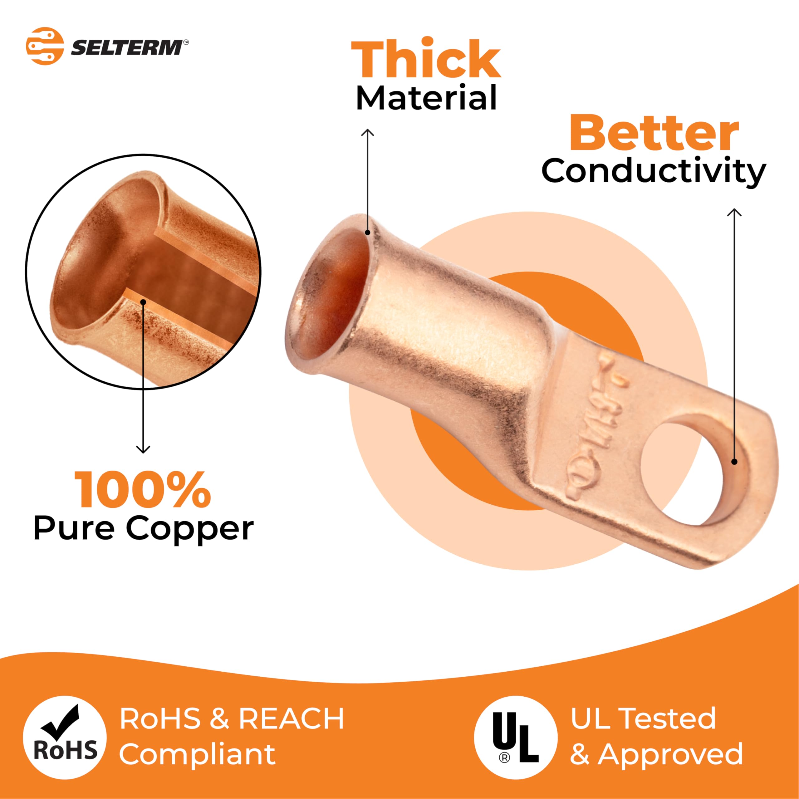 HEAVY DUTY WIRE LUGS: Our ring terminal connectors are tested to meet S.A.E conductivity standards J163 & J1811; UL listed to U.S. & Canadian safety standards and rated to 600V+ when properly installed; RoHS & REACH compliant; These Battery cable lugs Connectors are listed under UL File Number E254831