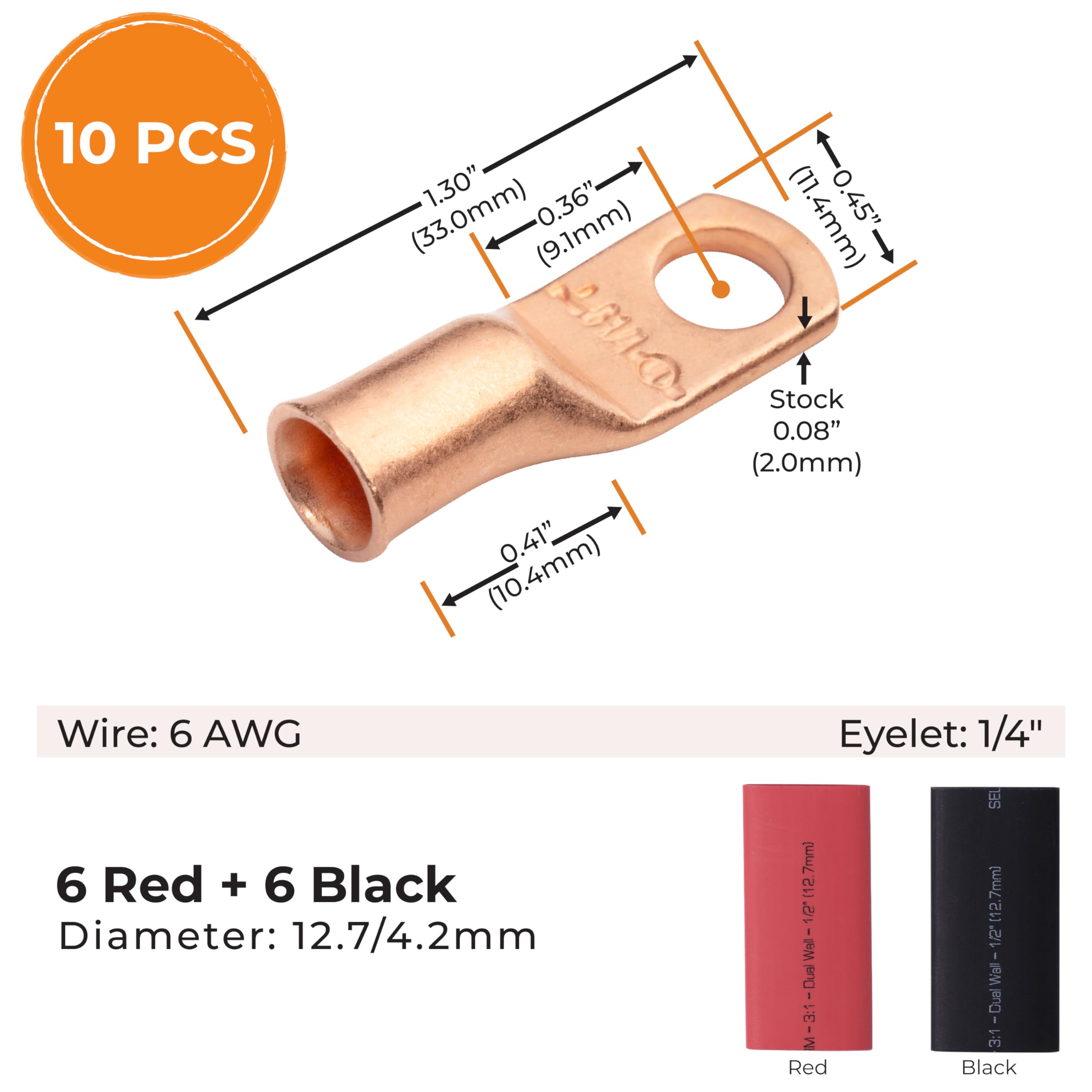 Package Contains: Each purchase includes 10pcs 6 AWG - 1/4" stud battery lugs ring terminal connectors, along with 12pcs 3:1 black & red heat shrink tubing with adhesive; This comprehensive kit provides all the essentials for maintaining efficient and lasting battery connections