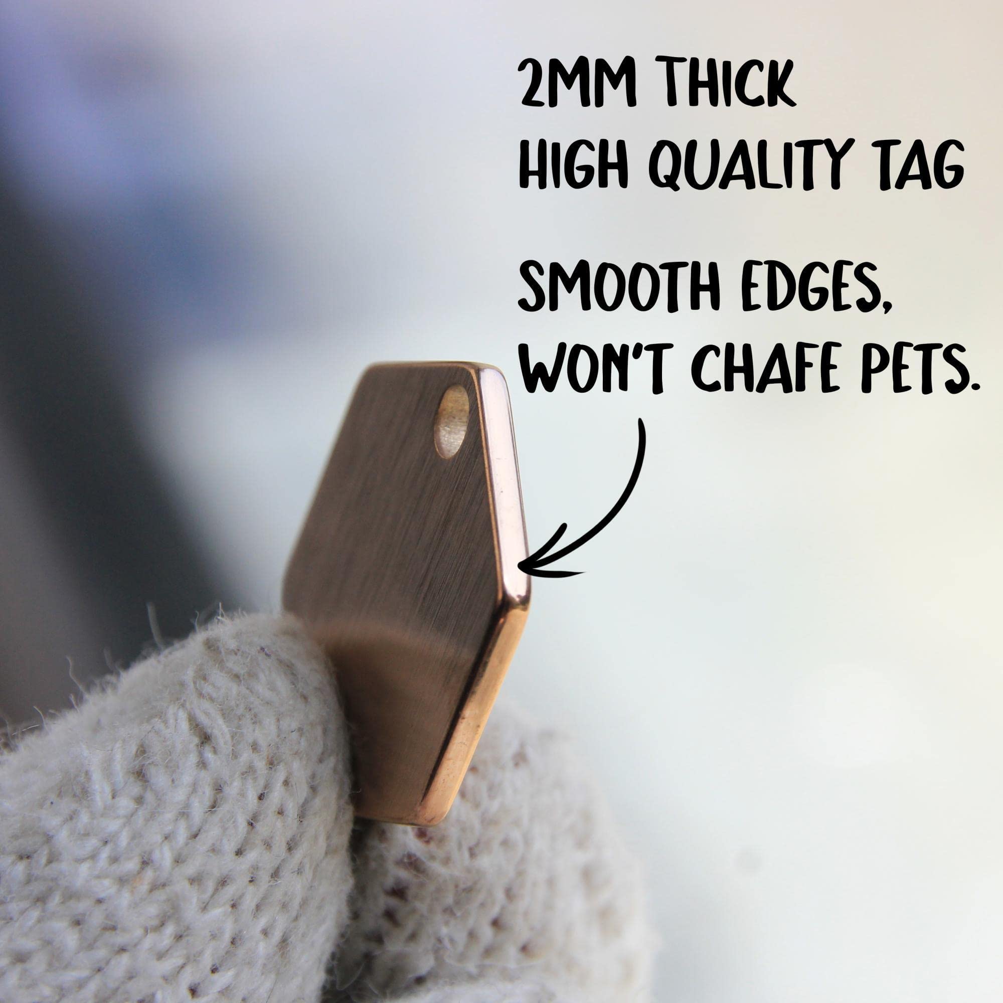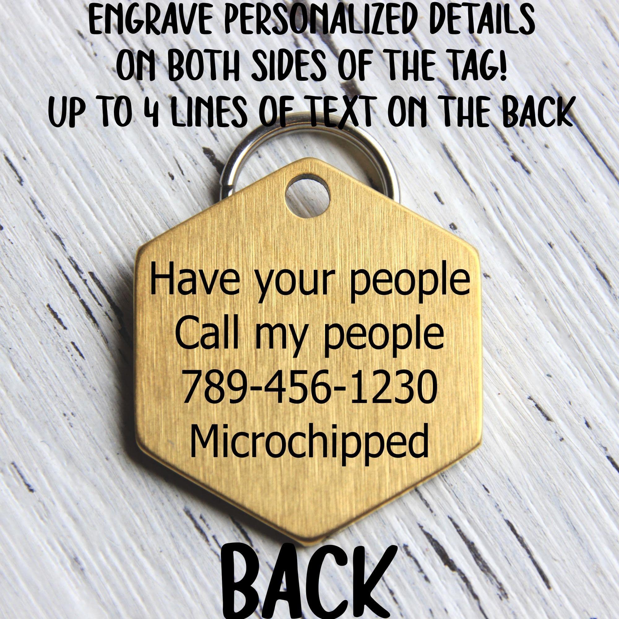 Double-sided pet ID tags for complete customizable info - We present excellent front designs and also center your contact info on the back of the tag.