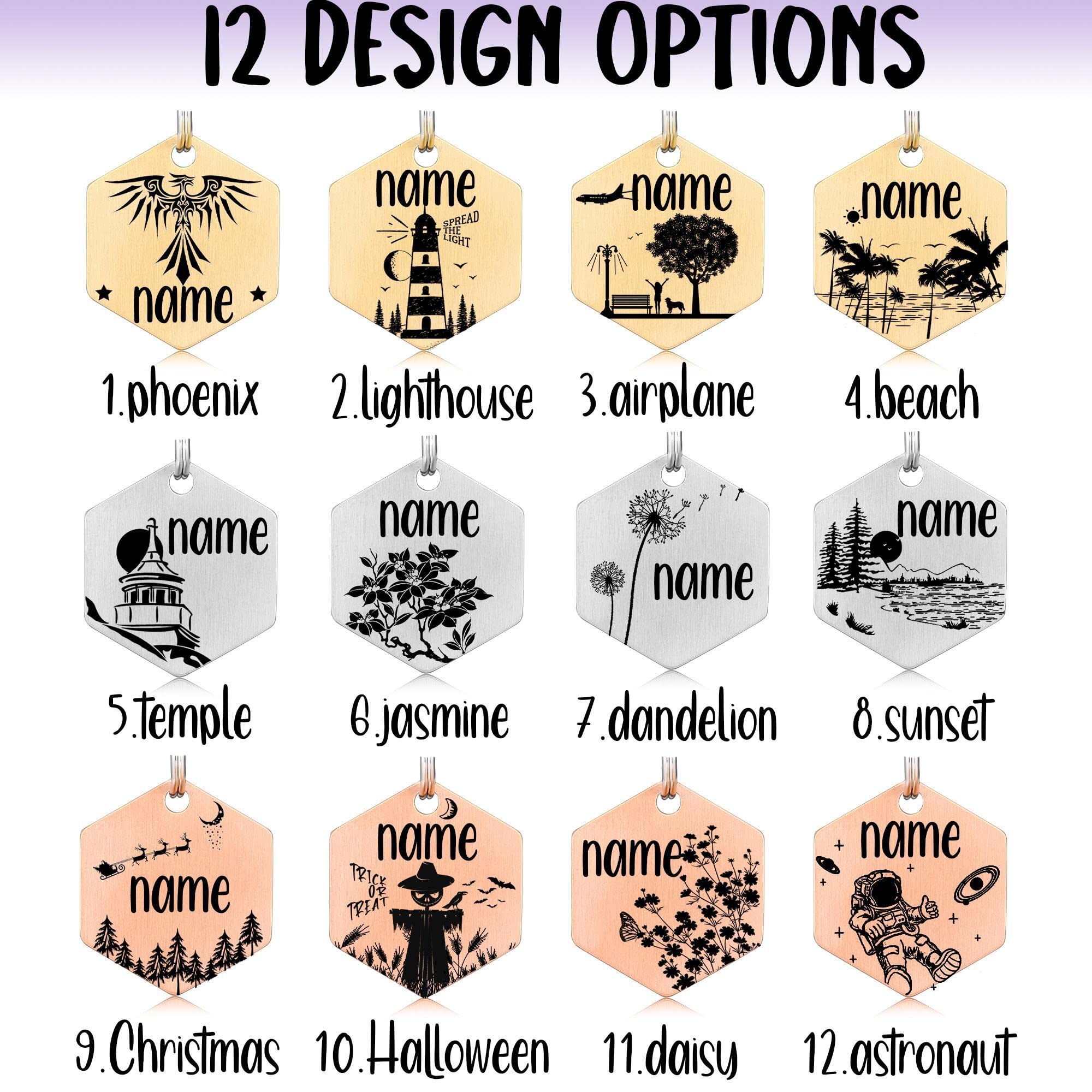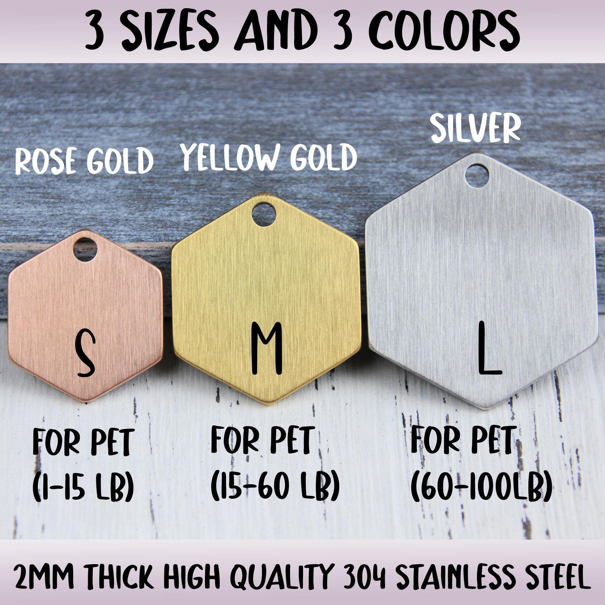 Different sizes for different pets - Small for 1~10 lb pets, Medium for 10~50 lb pets and Large for pets over 50 lb. Up to seven different available shapes: round, diamond, moon, heart, star, hexagon and hexagram. Referring to the images, you can find details about tag sizes and shapes.