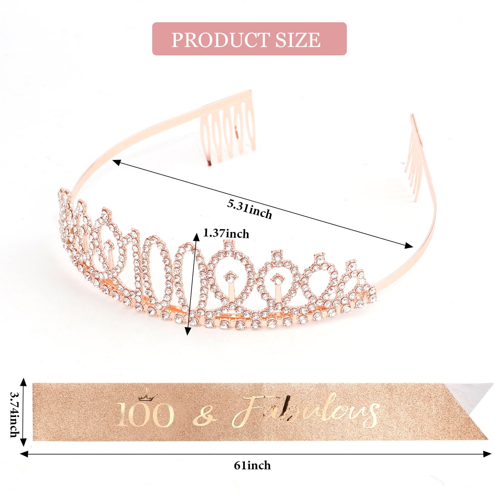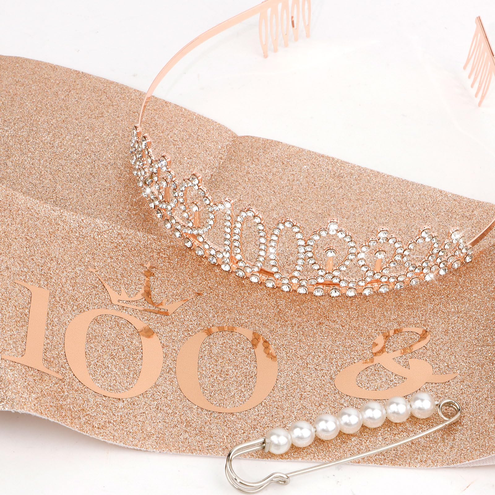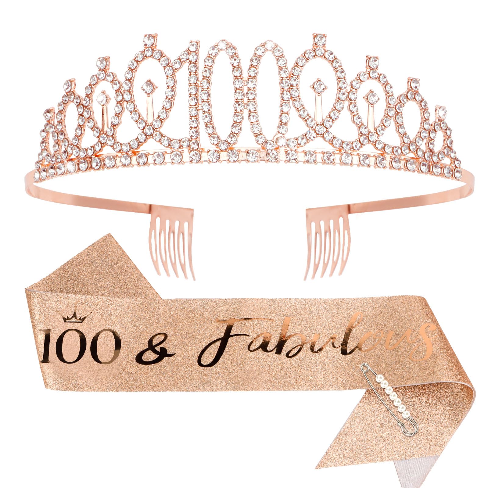 The Perfect 100th Birthday Decorations for Women: "100 & Fabulous" birthday sash + rhinestone 100 tiara rose gold.